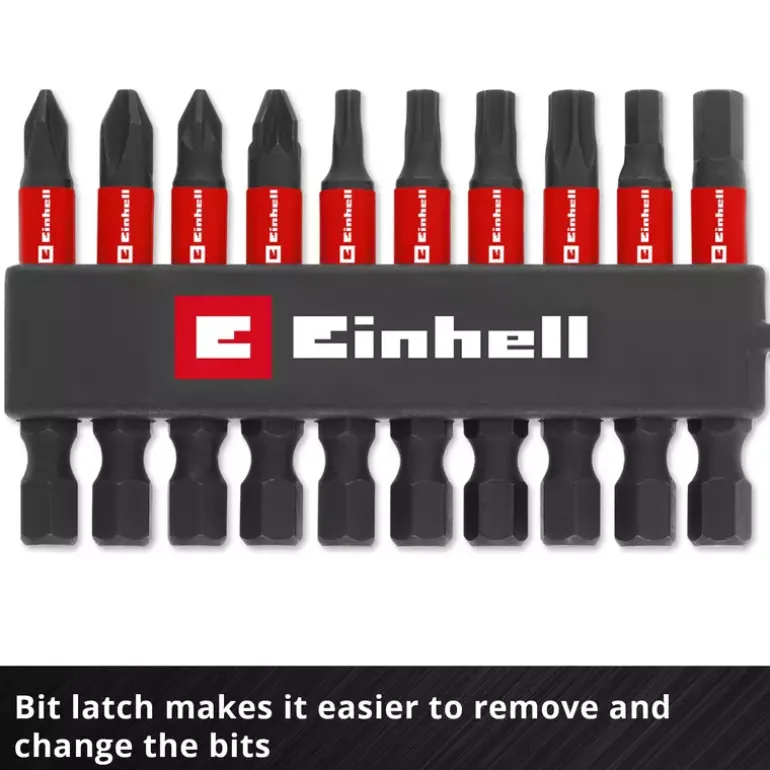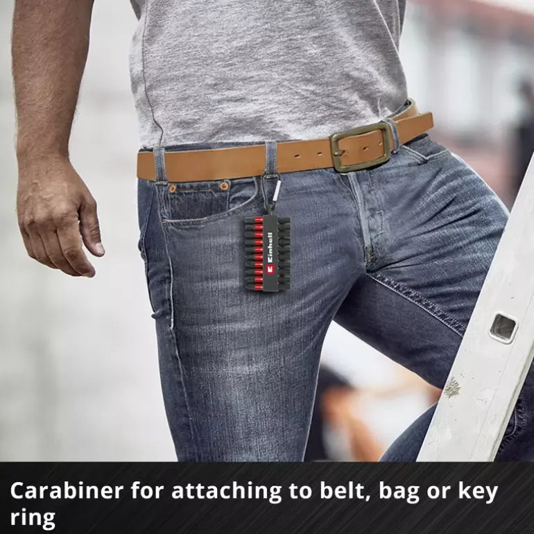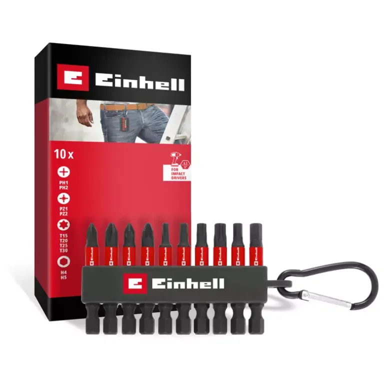 The 10-piece Einhell impact bit set in pocket size with carabiner contains 50 mm long impact bits with the profiles PH1 / PH2 / PZ1 / PZ2 / T15 / T20 / T25 / T30 / H4 / H5. They are made of manganese-phosphatised S2 steel, which offers above-average hardness and is therefore particularly wear-resistant and durable. All bits have an output marking and the Einhell logo on the red coloured ring. Thanks to the E 6.3 shank, they fit all standard drill chucks and bit holders in commercially available impact screwdrivers, cordless screwdrivers and drills. Fitted in a practical Einhell bit bar, the impact bits are easy to remove and quick to change. The sturdy snap hook enables particularly flexible use and attachment of the bit set to belt buckles, bags and key rings. This makes the impact bit set particularly practical for mobile use and is suitable for universal screwdriving and fastening work, such as assembling furniture or minor repair work. The easy handling and compact design make the bit bar an indispensable companion for everyday use.