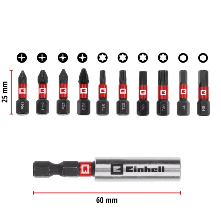 - 25 mm impact bits in the most common drives: PH, PZ, T and H