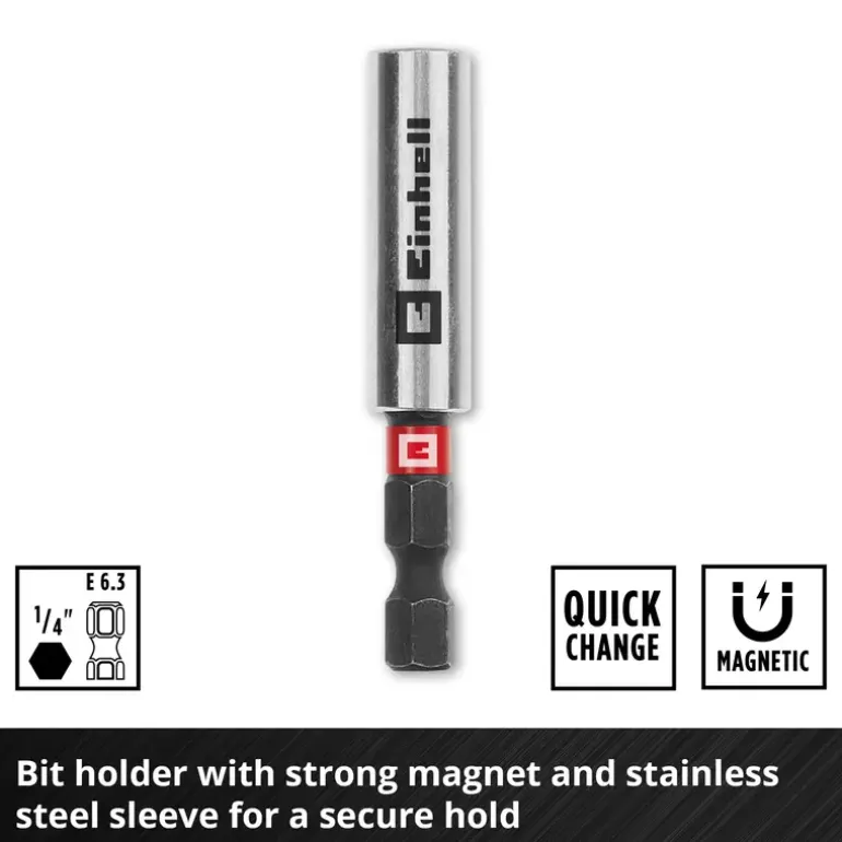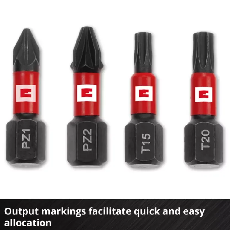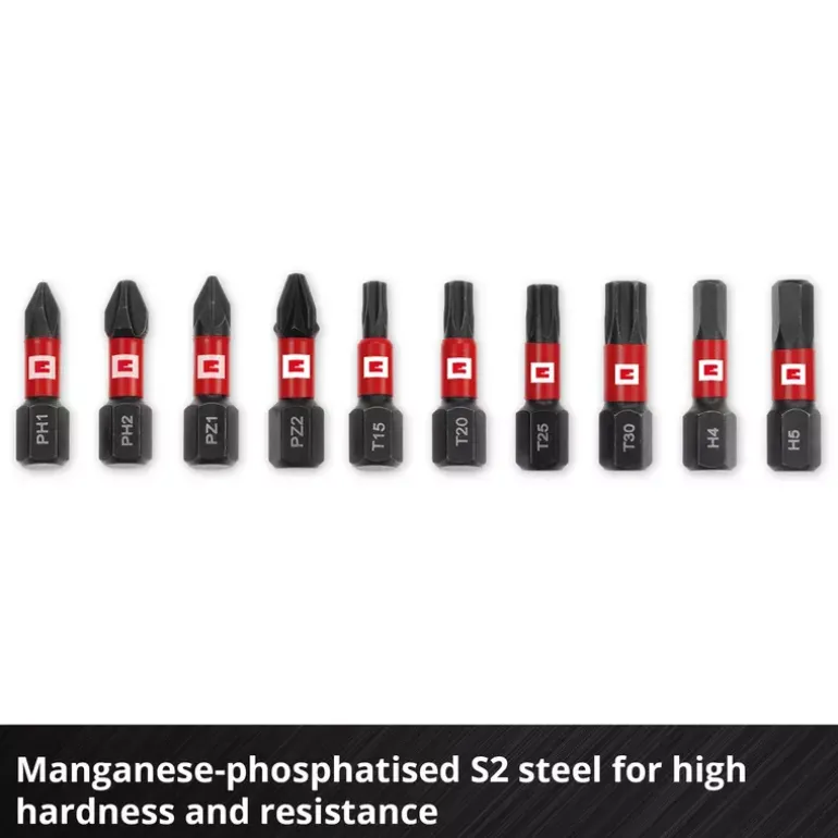 The 11-piece pocket-sized impact bit set from Einhell includes impact-resistant 25 mm bits with a C 6.3 shank with the most common profiles, including Phillips (PH1 / PH2), Pozidriv (PZ1 / PZ2), Torx (T15 / T20 / T25 / T30) and Hex (H4 / H5). Each impact bit has a red shrink sleeve with Einhell logo and is labelled with an output marking for quick identification of the bits. Made from manganese-phosphatised S2 steel, they offer above-average hardness, which makes them particularly wear-resistant and durable. In addition to the ten impact bits, the bit set also includes a 60 mm long bit holder made of chrome vanadium with an E 6.3 shank and hexagon socket. Thanks to the integrated, strong magnet and its stainless steel sleeve, it provides an effective hold for the bit and screw. The impact bits can therefore be used with the bit holder and fit into all commercially available impact screwdrivers, cordless screwdrivers and drills. The bit set is stored in a compact pocket cassette, which is equipped with a practical opening mechanism. This enables the cassette to be opened and the bits to be removed easily. The compact design makes the 11-piece bit set ideal for universal screwdriving and fastening work, both at home and when travelling.