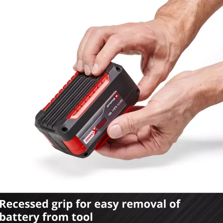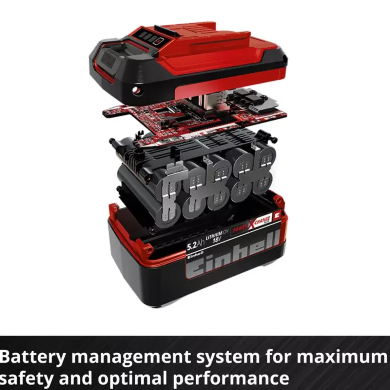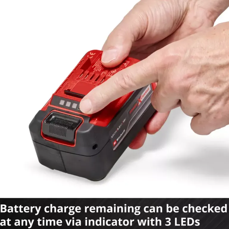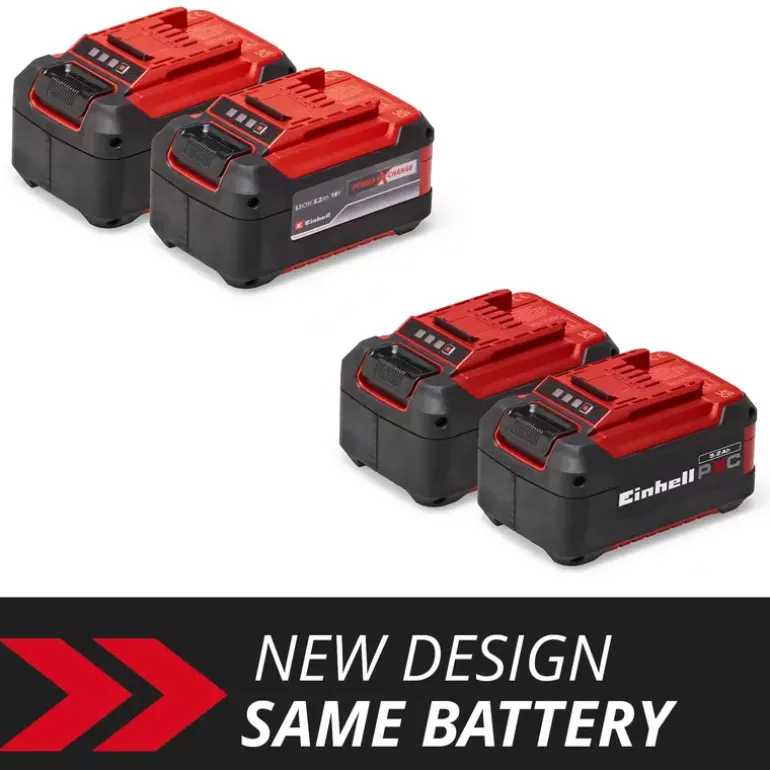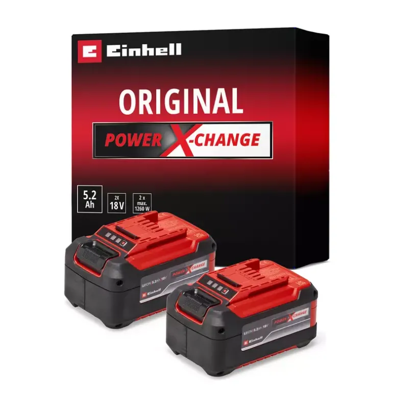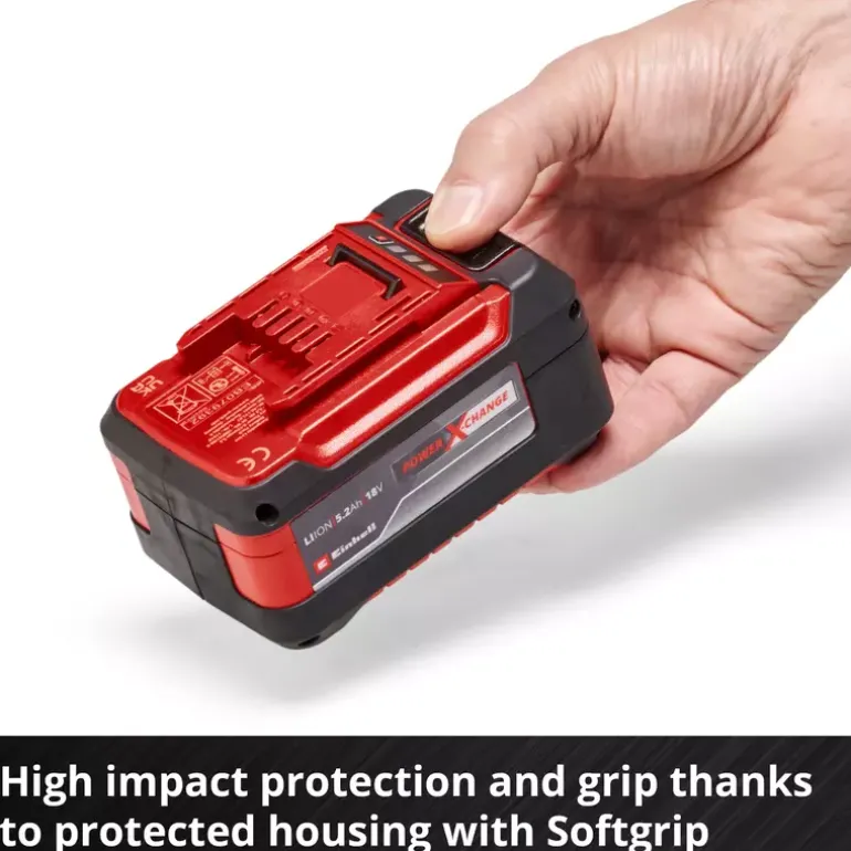 The 2x 18V 5.2 Ah Power X-Change PLUS batteries are members of the multifunctional and completely interchangeable Power X-Change rechargeable battery system from Einhell. The Power X-Change rechargeable batteries can be used universally for supplying power and endurance to every cordless tool from the entire garden and workshop product family. The 18 V 5.2 Ah PXC PLUS is a high-end rechargeable battery from the Power X-Change family and is also suitable for TWIN-PACK use for 36 V applications. With two 5.2 Ah batteries as TWIN-PACK the working time will be prolonged and the batteries can provide more power (2x 18V = 36 V) for power-demanding applications. The ABS process-controlled active battery management system has a microprocessor for permanently monitoring the battery parameters. It therefore ensures maximum safety, optimum tool performance, maximum operating time and a maximum service life. The current charge level can be checked on a 3-step LED display. The housing is designed to be resistant to dust, corrosion and mechanical influences. The rubber coating provides high-impact protection for the battery along with a good grip. There is a trough handle to enable it to be removed from each tool with ease.