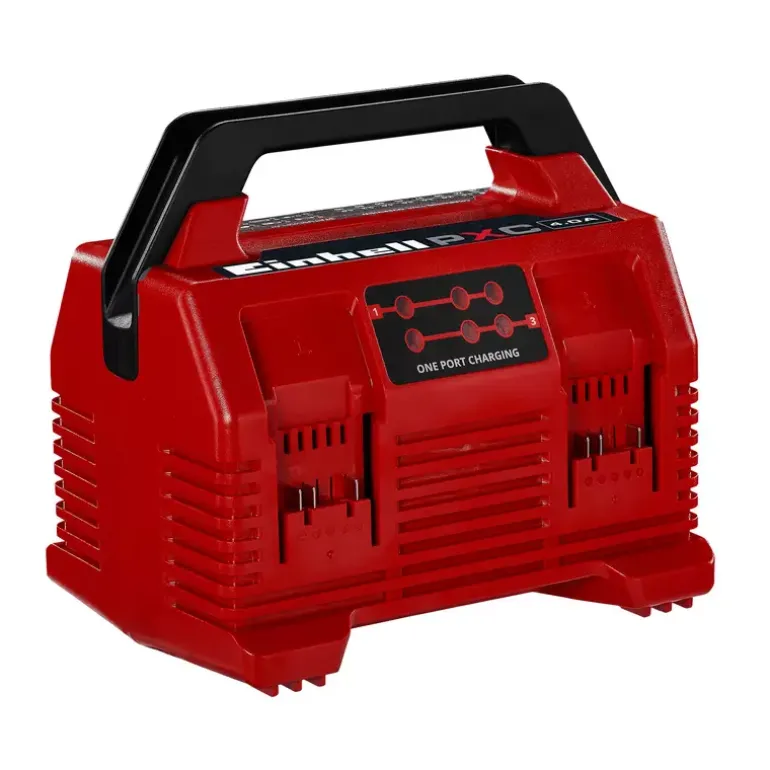 With the Einhell Power X-Twincharger 4A, two Power X-Change system series batteries can be charged at the same time. One battery for all devices: Power X-Change batteries can be used in all craft and garden tools of the powerful Einhell system series. The charger can be used universally for all PXC batteries. Continuous, simultaneous charging of two batteries – one battery per side – saves space and ensures not only fast and high availability but also uninterrupted work. Once two batteries are fully charged on each side, the next two are automatically charged. This is supported by a carrying handle, which allows easy and effortless transport of 4 batteries. Thanks to its low weight, the Quattrocharger is ideally suited for mobile use. Four battery slots can be used with one plug, saving space on work tables & construction sites. Thanks to the 4A fast charging technology, charging times are even shorter, and the battery is constantly monitored by the smart charging management system for optimal charging and top safety. Thanks to the refresh mode, it is possible to reactivate deeply discharged batteries. All current information is provided via a 6-stage LED status indicator for each battery.