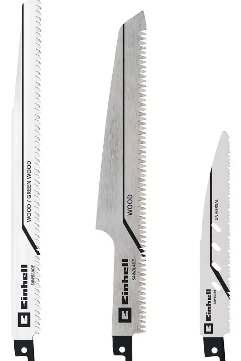 The Original Einhell 3-piece saw blade set is a suitable accessory for various Einhell universal saws. The set includes 3 different saw blades with universal shank. Included in the set are 2 saw blades for wood and 1 saw blade for metal. They can be used with all reciprocating saws. The 240 mm HCS saw blade is suitable for medium, coarser cuts in hardwood, softwood, construction woods, dry green wood and wet woods. The 230 mm long HCS saw blade with Japanese starlock ensures fine cuts in hardwood, softwood, construction wood, plastic-coated woods, and dry green wood, plastic. The 150 mm long BIM saw blade is suitable for fine cuts in metal, non-ferrous metal, wood with metal residues, mixed materials and plastic. All saw blades are particularly efficient thanks to their special sanding and can perform high cutting speeds. This makes them ideal for use with cordless universal saws.
