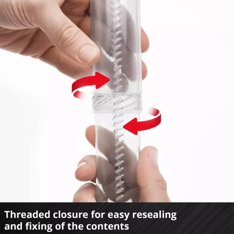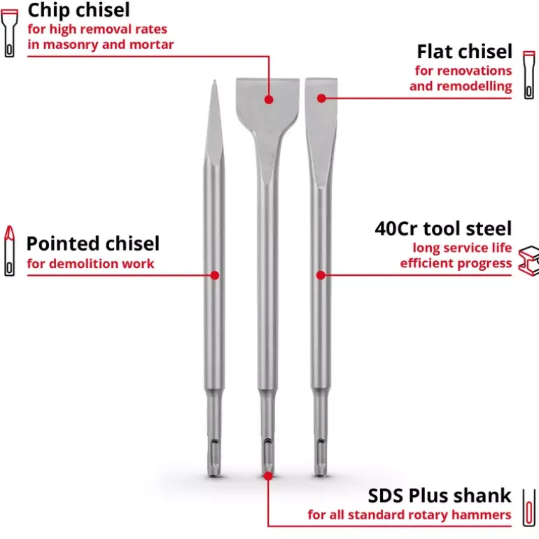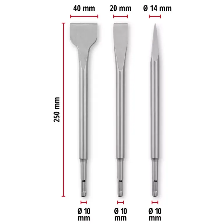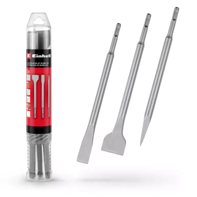 The 3-piece SDS Plus chisel set with a length of 250 mm is an all-in-one solution designed for a range of demolition and renovation work. It includes the most important chisel shapes: a pointed chisel, a flat chisel and a spade chisel. Each chisel is specialised for different tasks. The pointed chisel is ideal for demolition and demolition work, the 20 mm wide flat chisel offers a high material removal rate for renovations and remodelling and the spade chisel with its wide cutting edge of 40 mm ensures a high removal rate in masonry and mortar. All three chisels are made from high-quality 40Cr steel and are characterised by a very long service life and efficient progress. The chisels with SDS Plus receptacle are compatible with all common SDS Plus rotary hammers and enable flexible use. The chisel set is particularly suitable for hard materials such as concrete, masonry, sand-lime brick, aerated concrete and hollow block. This makes them an indispensable tool for DIY and sanitary work. They are ideal for renovating bathrooms or demolition work where efficiency is required. The chisels for hammer drills are stored in a robust, moisture and oil-resistant twist tube, which is infinitely adjustable in length using a twist mechanism. The threaded closure makes the tube easy to reseal to secure the contents. While the hexagonal end prevents the twist tube from rolling away, the Euro hole hanger is ideal for storing the 3-piece SDS Plus chisel set.