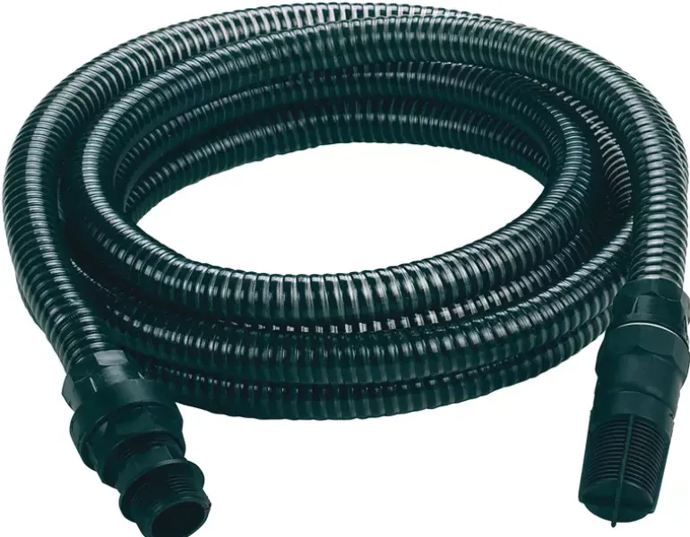 A semi-rigid suction hose for use with domestic water supplies: The Original Einhell suction hose is a semi-rigid hose with a diameter of 25 mm (1 inch) and a length of 4 m. Thanks to a 42 mm (1 ¼ inch) internally threaded connection, an included adapter with 33.3 mm (1 inch) internal thread and a plastic threaded nipple with 33.3 mm (1 inch) external thread, the Einhell suction hose is suitable for garden pumps as well as domestic water systems and automatic water pumps. The hose is made of hard plastic and is ideal for use with domestic water. In addition to the adapter piece and the plastic threaded nipple, the suction hose set also includes a plastic suction strainer with an integrated non-return valve. While the suction strainer prevents the intake of dirt particles, the non-return valve ensures that the water level in the suction hose does not drop.