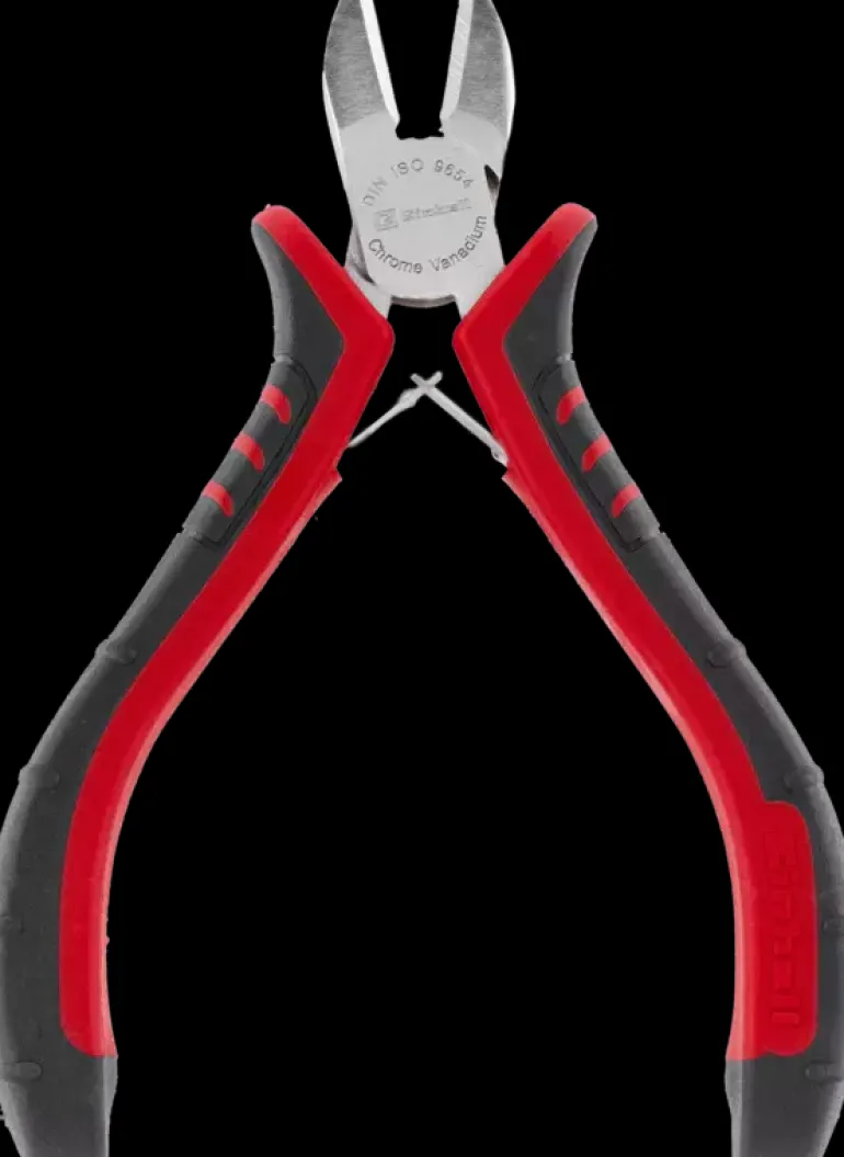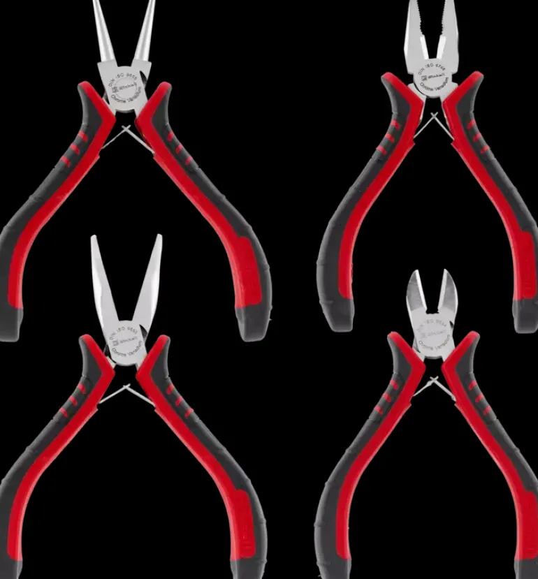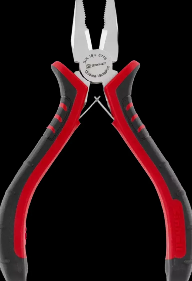 The 4-piece precision plier set from Einhell includes a 115 mm side cutter, a 120 mm combination plier with cutter, a 130 mm bent needle-nose plier, and a 130 mm round-nose plier. This tool set offers a versatile selection of precision pliers for delicate work in electronics, model making, or fine mechanics. All pliers are made of robust chrome vanadium steel, ensuring exceptional durability and resistance. The nickel-plated surface provides reliable protection against corrosion. Inductively hardened cutting edges on the side cutter and combination plier guarantee long-lasting sharpness, even with frequent use. The side cutter is equipped with short cutting jaws, allowing precise cuts in confined spaces – ideal for fine wire work. The combination plier, with its long-nose design and serrated gripping surfaces, ensures a secure hold on both flat and round workpieces. An integrated cutting function extends its range of use, for example when stripping or trimming wires. The bent needle-nose plier is perfect for fine gripping tasks in very narrow or hard-to-reach areas, while the round-nose plier is ideal for bending wires, rings, or loops. All four pliers are equipped with a leaf spring for automatic opening and reduced hand fatigue. Ergonomically shaped two-component handles provide a secure grip and ensure comfortable use, even during extended tasks.