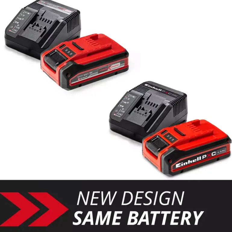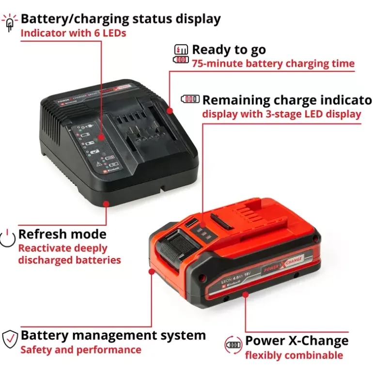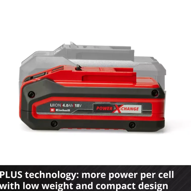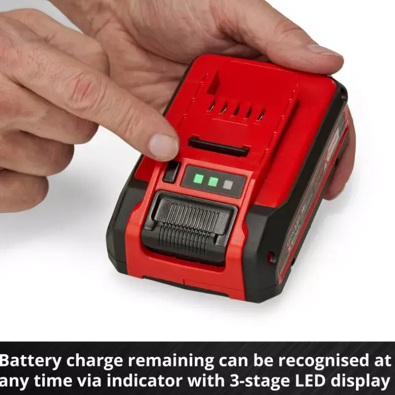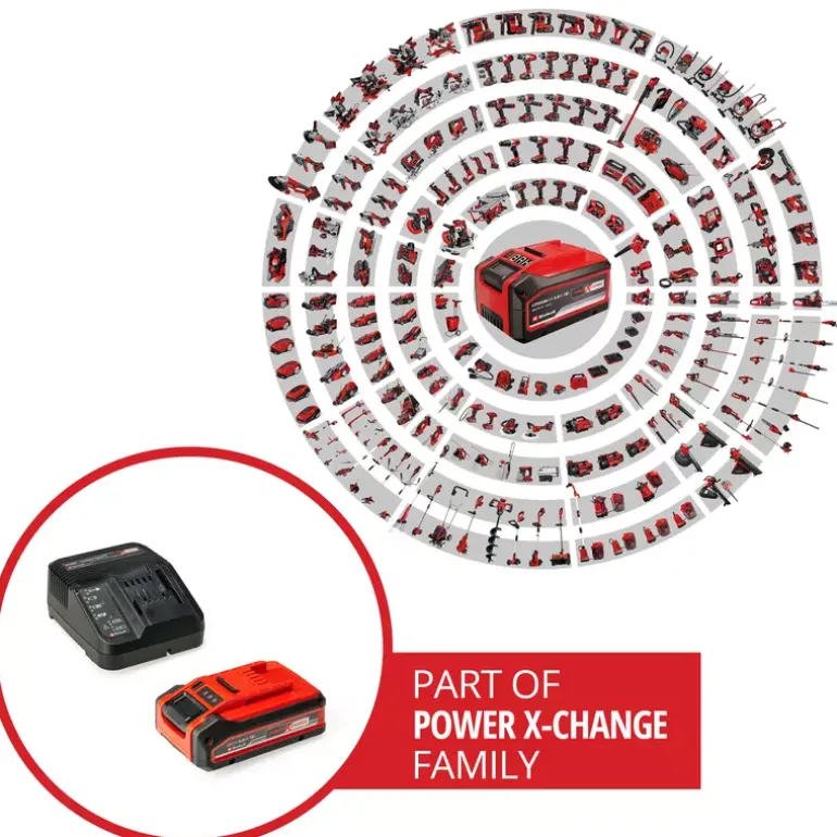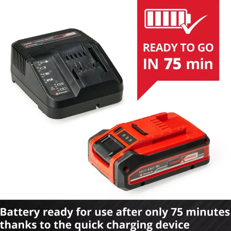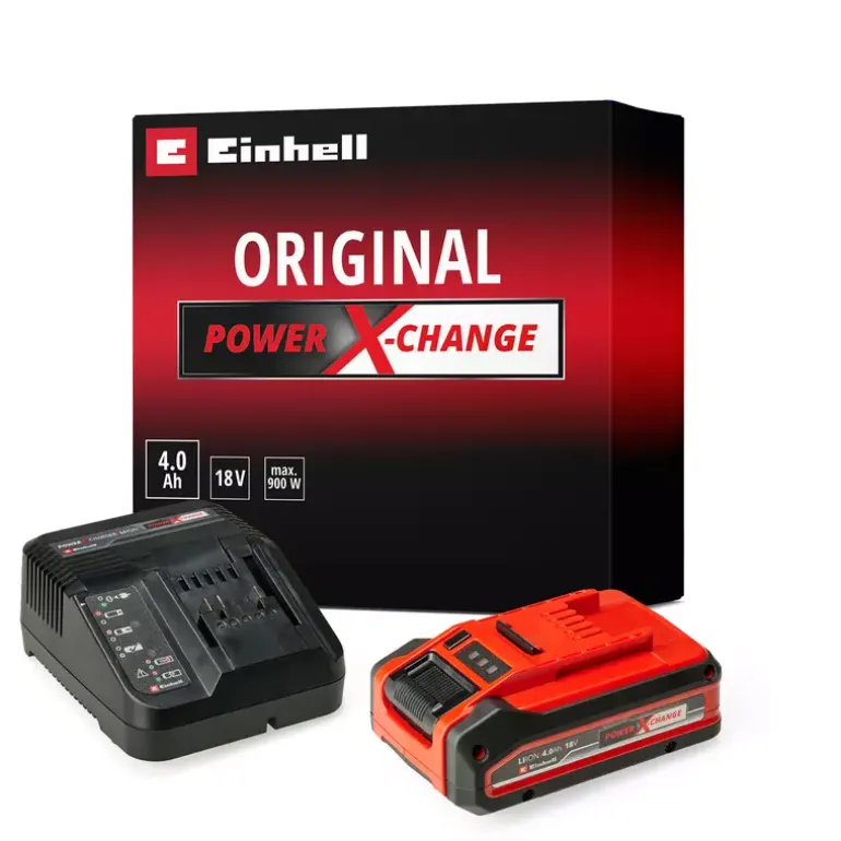 The Einhell 4 Ah PLUS Starter Kit is the perfect basis to start or expand the domestic Power X-Change range. The Starter Kit with an 18 V 4 Ah Power X-Change battery and the 3 A quick charging device is part of Einhell’s multifunctional and infinitely combinable Power X-Change battery system. The universal Power X-Change batteries supply all cordless tools in the entire product family in the garden and workshop sector with power and endurance. The charging devices in the range can also be used universally for all Power X-Change batteries. The advantages for customers are clear: With one battery and one charging device for all devices, you not only save considerable costs on the purchase, but its universal nature protects the environment and offers flexibility in the home and garden. There will be no mess and chaos with a wide variety of batteries and charging devices for each individual device. The high-quality battery resists the memory effect and the self-discharge that usually occurs in batteries for constant, high power. The 18-volt 4 Ah Power X-Change is the ideal basic battery for the Power X-Change family, and is also suitable for Twin pack utilisation with 36 V applications. The process-controlled ABS active battery management system continuously monitors the battery parameters using its integrated microprocessor. This ensures maximum safety, optimal device performance, maximum runtime and maximum service life. You can check the current charge status via the 3-setting LED indicator. The design of the housing makes it resistant to dust, corrosion and mechanical influences. Due to the recessed grip, the battery can be easily removed from all devices. The fast charging device is compactly designed and therefore requires little space. Utilising the hanging loops means that the charging device can be easily assembled on the wall. Fast charging technology creates shorter charging times and the battery is constantly monitored by the smart charging management system for optimal charging and top safety. Refresh mode makes it possible to reactivate deeply discharged batteries. All current information is provided via the 6-stage LED status indicator.
