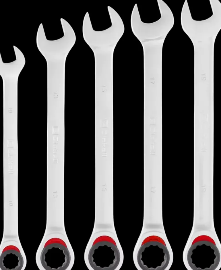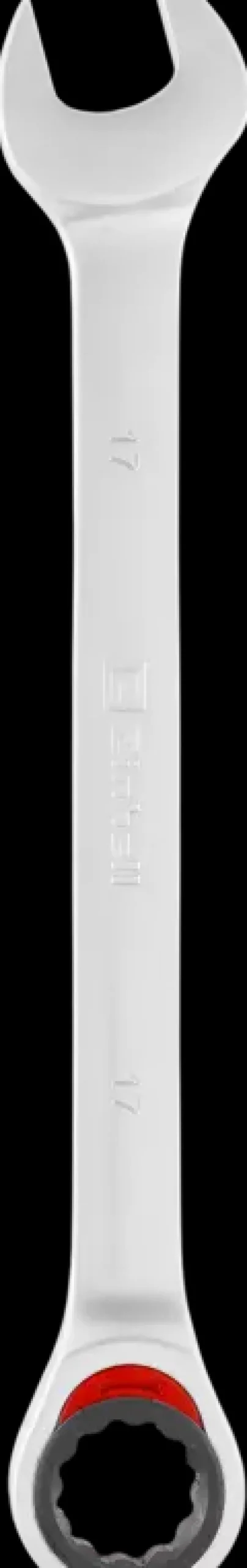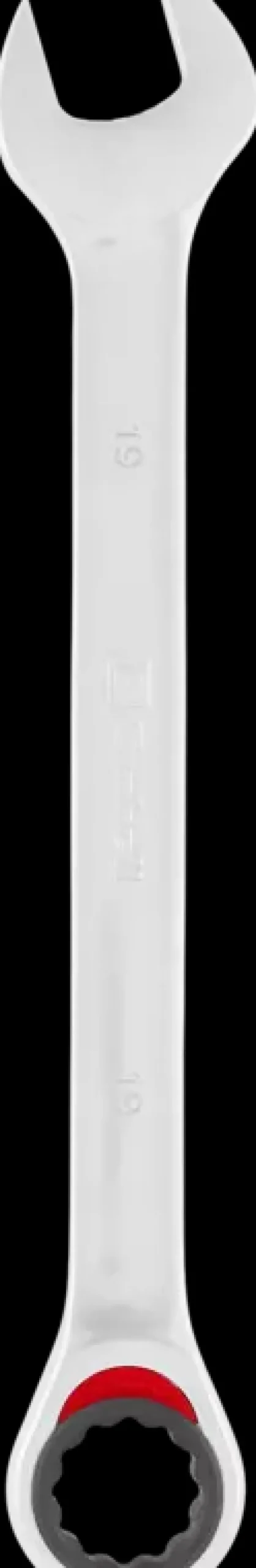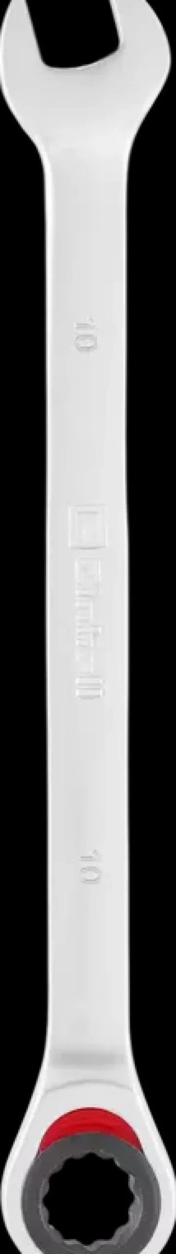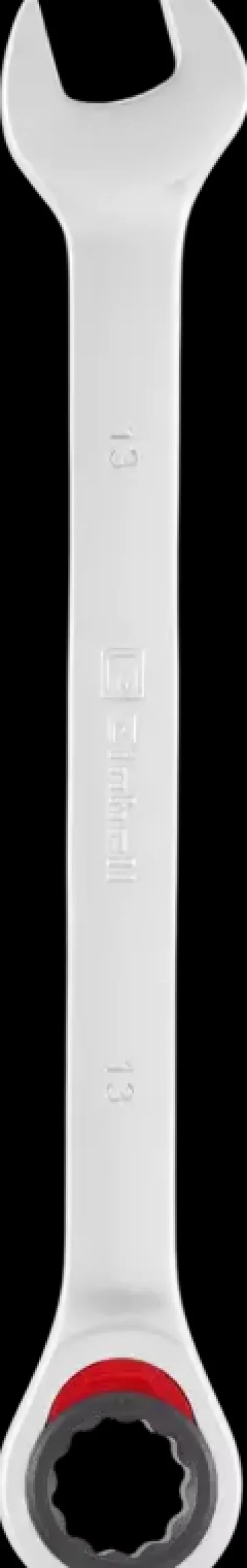 The 5-piece combination ratchet spanner set from Einhell includes spanner sizes 10, 13, 15, 17, and 19 mm for a wide range of fastening tasks. Each spanner is equipped with two heads: an open-end spanner on one side and a ratcheting ring spanner on the other. This combination allows flexible working, enabling both quick tightening and loosening with the black ratchet and controlled turning with the open-end spanner. Made of high-quality CrV steel, the spanners are highly resistant to wear and offer a long service life. The pickled surface provides effective corrosion protection while giving the tools an elegant, matte finish. The wavy profile ensures a secure grip on the screw and prevents slipping, making work both more comfortable and safer. The combination ratchet spanner set is ideal for automotive work, workshop use, or assembly tasks.