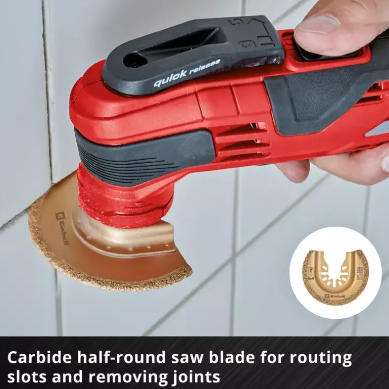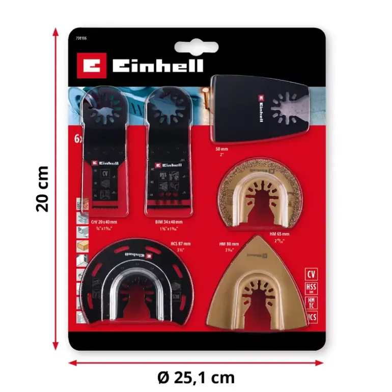The 6-piece multitool set from Einhell consists of versatile and robust multitool tools for DIY enthusiasts and professionals. It includes various multitool saw blades, a rasp and a scraper, which are specially designed for sawing, sanding and removing various materials. The multitool accessory set includes a bi-metal plunge saw blade with a width of 34 mm and 18 TPI, the teeth of which are made of hardened high-performance high-speed steel. This saw blade is ideal for sawing non-ferrous metals, sheet metal, wood with nails, drywall materials and plastics, as it has a high cutting performance and long service life. The BIM plunge saw blade is equipped with holes that enable faster chip removal and thus ensure a higher cutting speed and precision. The Einhell multi-tool accessory is complemented by a half-round saw blade with a diameter of 87 mm and 18 TPI. Made from HCS carbon steel, the blade impresses with its robustness and flexibility to cut hardwood, softwood and various types of plastic effectively. The multi-tool set also includes a 20 mm wide plunge saw blade made of robust CrV tool steel, which is also suitable for hard and soft wood as well as various types of plastic . The carbide-coated half-round saw blade with a diameter of 65 mm is specially designed for hard materials such as tiles, aerated concrete and plaster. Its carbide-coated cutting edge enables slits to be cut and joints to be removed easily. The multi-tool set also includes the Delta rasp with a diameter of 80 mm and a carbide-coated underside, which is ideal for coarse sanding of mortar, plaster, levelling compound, tile adhesive and even carpet residue. The multi-tool set is completed by a flexible scraper with a width of 50 mm, whose flexible body makes it easy to remove adhesive residues and silicone residues. The practical quick-change function of the blades using the Open Back Quick Change receptacle makes it easier to change the attachments quickly and increases efficiency at work. This makes the multi-tool set compatible with standard multi-tools, with the exception of Starlock machines.