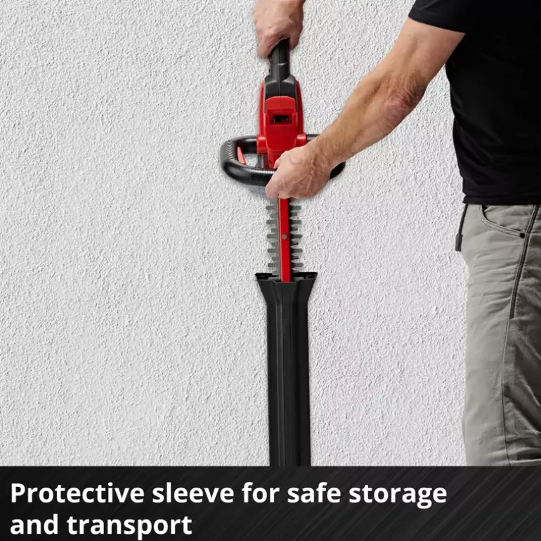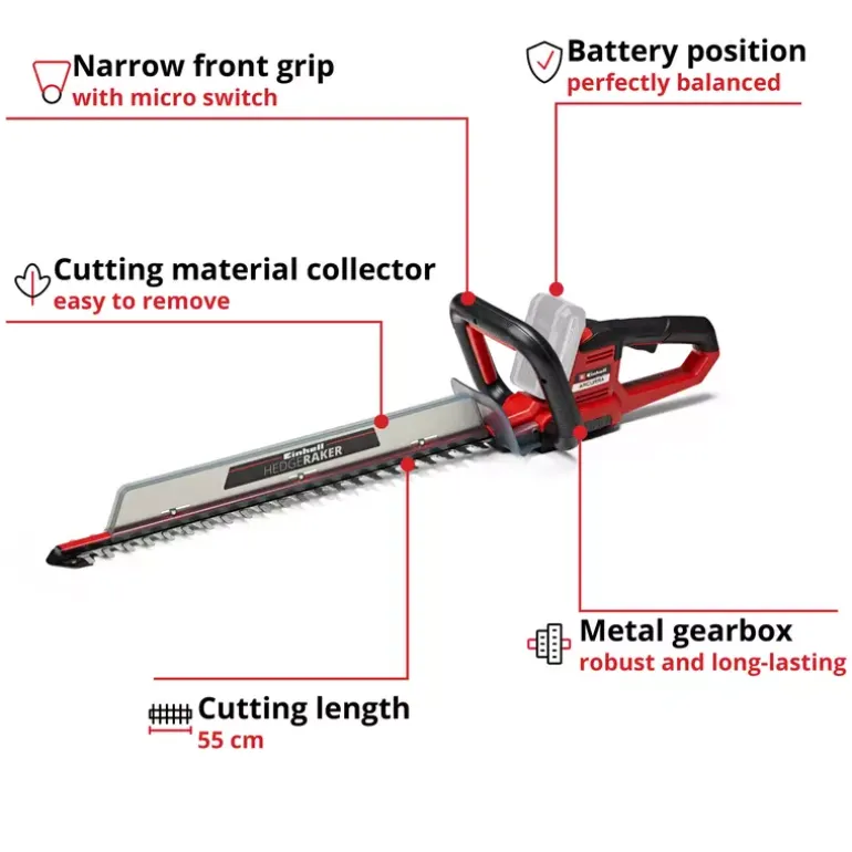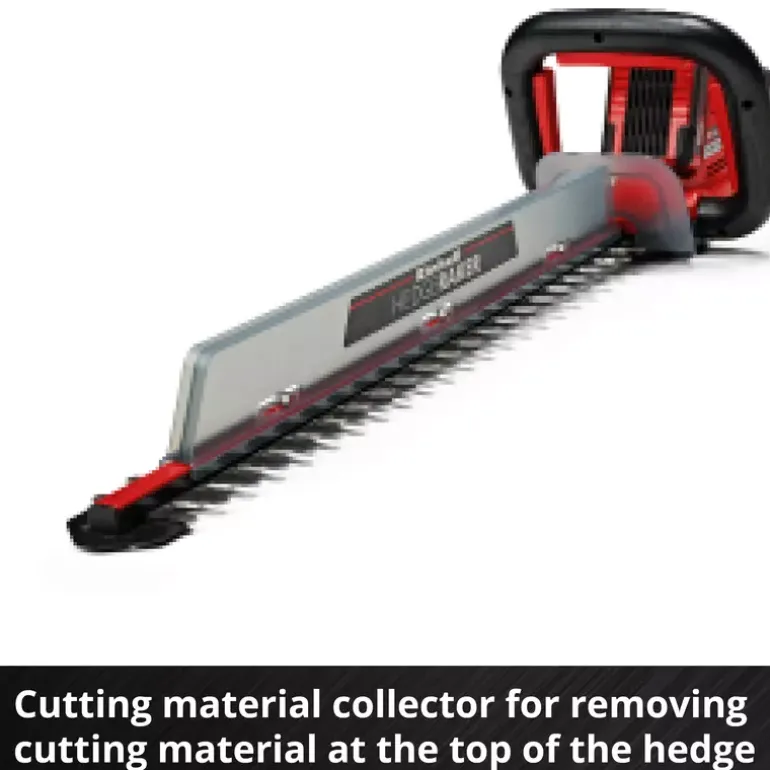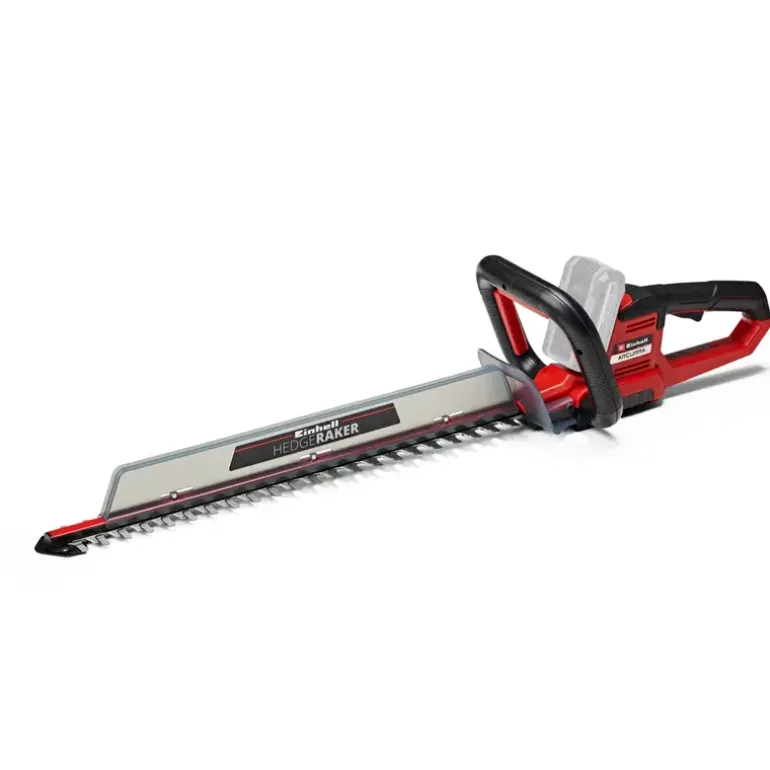 The Einhell ARCURRA 18/55 Cordless Hedge Trimmer is a powerful member of the Power X-Change family from Einhell. The innovative PXC range really delivers with impressive performance and maximum flexibility: The lithium-ion rechargeable batteries can be freely exchanged between the tools in the Einhell system range. The blades of the ARCURRA 18/55 Cordless Hedge Trimmer are made of laser-cut and diamond-ground steel and are designed for maximum precision and durability. With them, the cordless hedge trimmer achieves a cutting length of 55 cm with up to 2,400 cuts per minute. The ergonomic, narrow handle of the ARCURRA 18/55 is equipped with a micro-switch. The robust metal gearing ensures that the cordless hedge trimmer is built to last. When trimming the hedge, clippings can be carried away from the top of the edge with incredible ease thanks to the practical collector that is provided. The aluminum cover over the cutters protects the blades, and the sturdy cutter guard offers protection during storage and can also be used for safe transport. Also included in the delivery is an impact protection guard with a holder for wall mounting. This unit is supplied without a battery and charger, which are available separately – for example as a practical starter set. An 18 V Power X-Change battery is required for operation of the Einhell ARCURRA 18/55 cordless hedge trimmer.