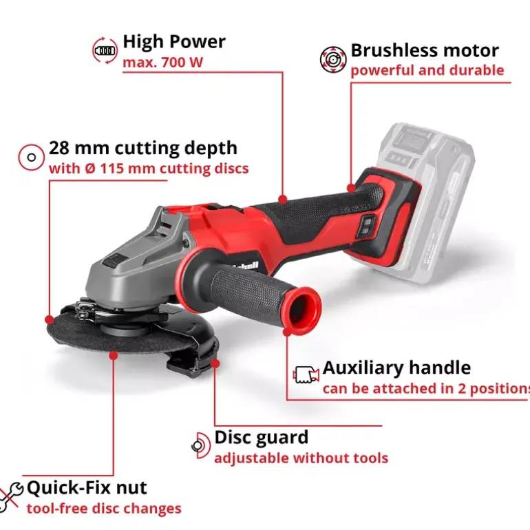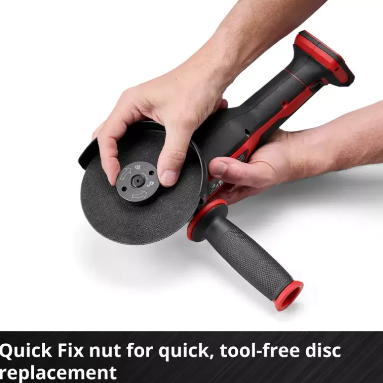 The Einhell Professional cordless angle grinder AXXIO 18/115 Q proves its worth as a helper for work in the workshop, house and garage. Powerful, wireless and comfortable, these are the attributes that were highly valued in the concept. The angle grinder is a member of the Power X-Change family, where one battery can be used in all devices in the system series. The 2.5 Ah battery and more powerful batteries of the series provide optimum results. The device is powered by an Einhell PurePOWER Brushless motor. This brushless motor offers more power and a longer running time than conventional carbon brush motors. Once you register online, the Brushless motor has a 10-year guarantee. Thanks to its powerful motor, the cordless angle grinder delivers the same power as a corresponding corded device with 700 W. Soft start and restart protection serve increased user safety. Two integrated dust screen protect the interior of the angle grinder from dirt and, in combination with the intelligent air ducting, increase the service life. The grilles can be removed for easy cleaning. The slim design with ergonomic Softgrip and additional handle makes it pleasant to work with. The decoupling of the motor and transmission ensures smooth running. The quick-adjust disc guard ensures flexible working. The additional handle can be assembled in two positions as required. With the quick-fix groove, there is no longer any need for an end-hole wrench for changing the cutting disc: The exchange is quick and tool-free. The cordless angle grinder is equipped with overload protection. Attention has been paid to durability with the robust aluminium gearbox housing. The battery and charger are not included. A suitable cutting disc (disc diameter 115 mm) is also available separately.