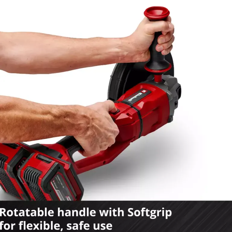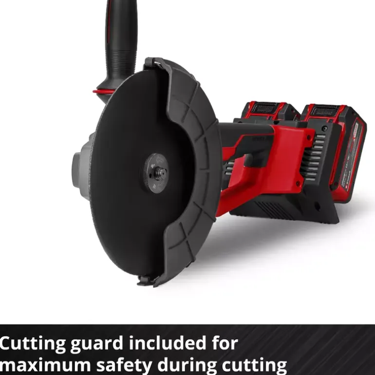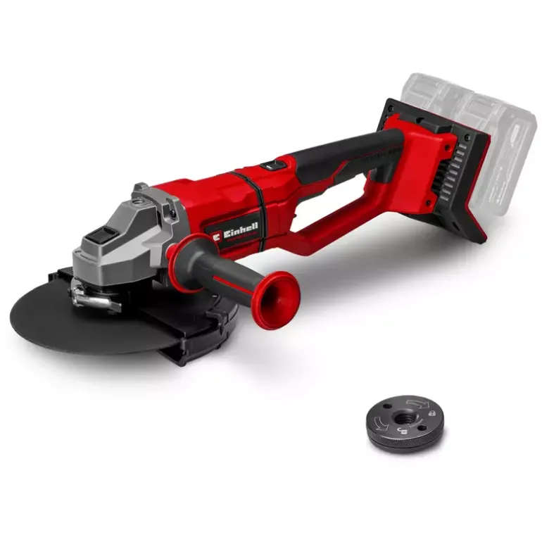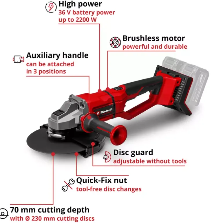 The Einhell cordless angle grinder AXXIO 36/230 Q is a proven tool for cutting and polishing. Whether you’re working with metal or stone: The different applications are diverse. The angle grinder is a member of the Power X-Change family; 2x 18 V batteries are required for operation. Thanks to this TWIN-PACK technology and the brushless motor, more power and a longer running time are guaranteed. Thanks to its powerful motor, the cordless angle grinder delivers the same power as a corresponding corded device with 2200 W. The quick-release nut ensures quick, tool-free disc change. The rotating main handle offers maximum flexibility, while the disc guard with quick adjustment allows flexible working. The anti-vibration function ensures low-vibration work. The slim design with ergonomic softgrip enables comfortable use, while the additional handle can be flexibly mounted in 3 positions. The cordless angle grinder offers a wide range of applications due to the extremely large cutting depth of 70 mm. Softstart and restart protection ensure increased user safety, while battery protection protects against flying sparks and dust. The robust aluminium gearbox housing and the overload protection guarantee durability. A 3.0 Ah battery or above is strongly recommended for best results. Delivery does not include a battery or charger, and these are available separately in a practical a starter kit. Cutting discs also not included.