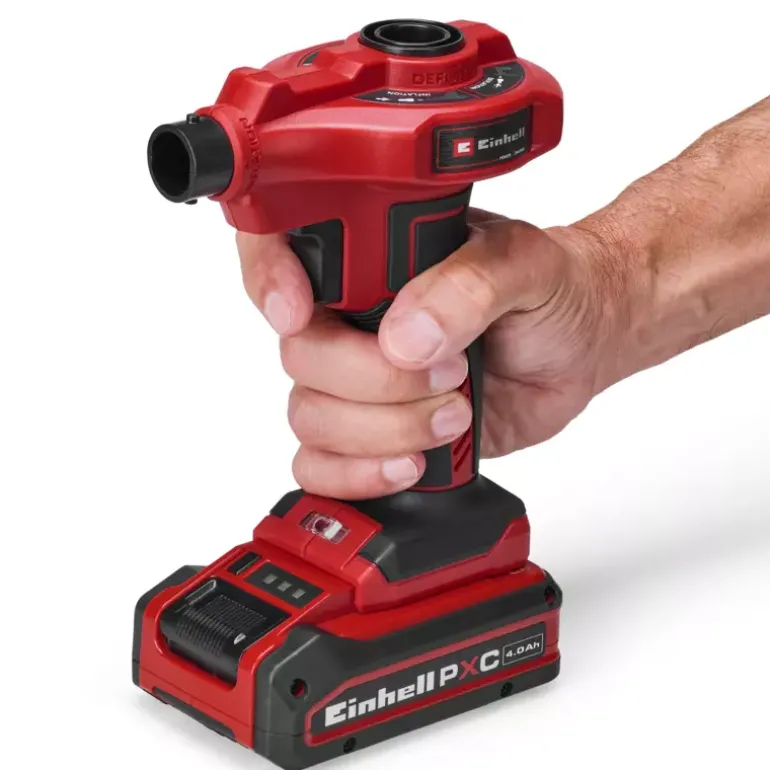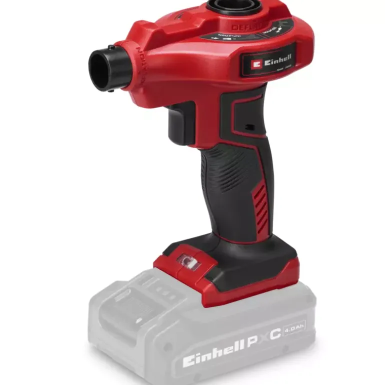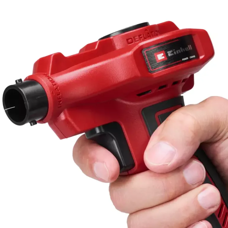 The Einhell cordless air pump CE-AP 18 Li-Solo offers cordless freedom as a member of the Power X-Change family. It is used for inflating rubber dinghies, air mattresses and leisure items or as a workshop blower and for cleaning working surfaces. With the help of two valve adapters, flexible application is ensured. Filling at 670 l/min and max. 0.05 bar. The locking switch allows effortless work, and the LED light ensures optimal lighting even in low lighting conditions. The ergonomic handle increases ease of use. An 18 V battery from the Power X-Change series is required for operation. The battery and charger are available separately, for example as a practical starter set from Einhell.