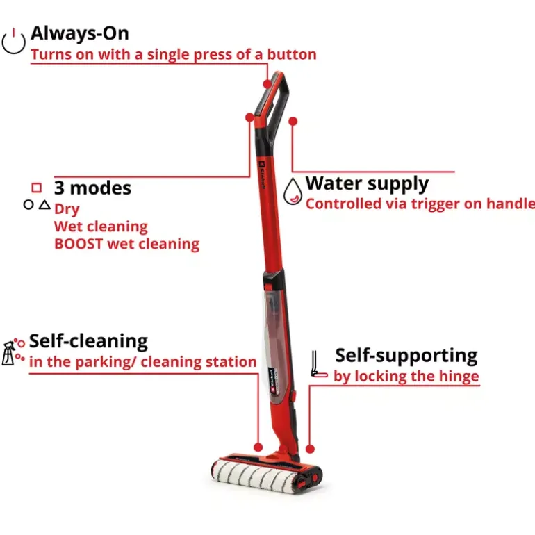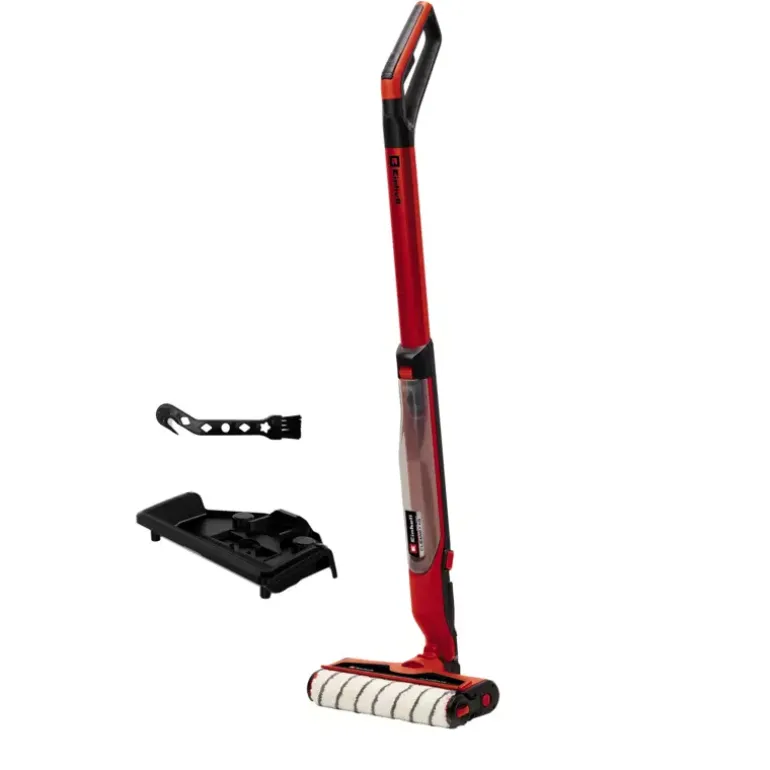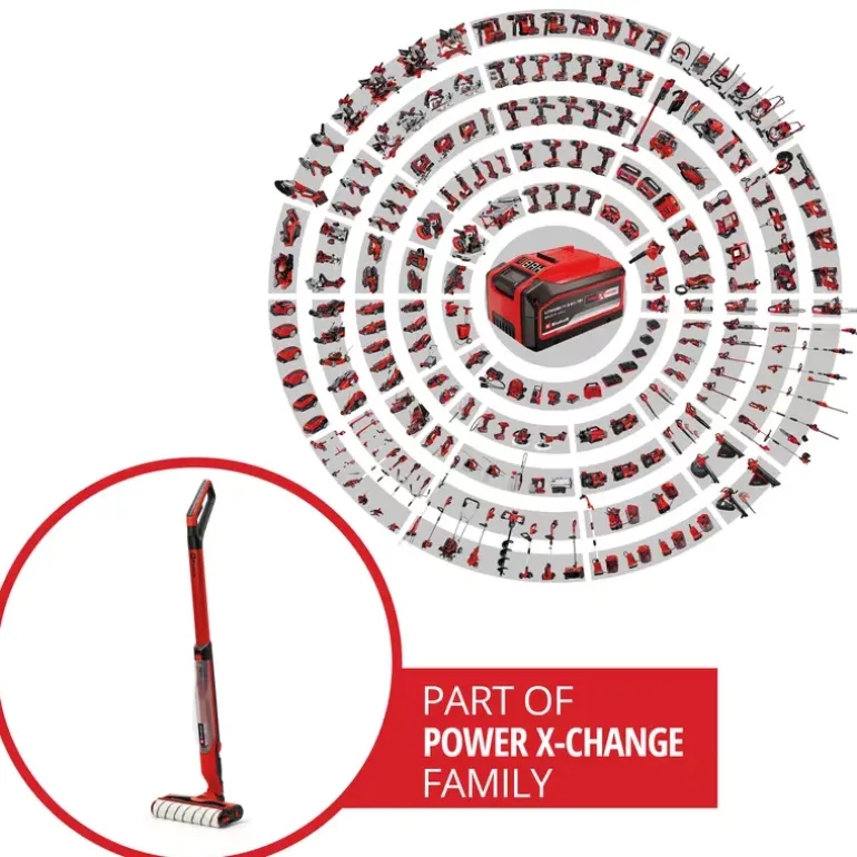 The Einhell Cordless Hard Floor Cleaner CLEANEXXO is your hard-working helper for cleaning around the house, and as a replacement for the mop, it makes the perfect partner for the vacuum cleaner. As a member of the Power X-Change family, the hard floor cleaner can be combined with all batteries and chargers across the system. Thanks to the removable battery system, the cleaner offers unlimited, cordless runtime: when one battery is empty, just insert the next one and continue mopping. The water supply, i.e. flow rate, is controlled directly via a trigger on the hard floor cleaner’s handle. When used in the standard and BOOST modes, which change the speed of rotation of the roller, the cleaner removes both regular dust and dirt, as well as stubborn stains. In BOOST mode, the water flow rate also increases when the trigger is pulled. If no water is fed, the roller can also just absorb the moisture from the floor and thus dry it. The floor cleaning brush is moistened by water supplied from the 400 ml clean water tank. The water is collected up again by a special mechanism and fed into the waste water tank (300 ml). Both tanks can be completely removed from the device for filling, emptying and cleaning. Thanks to its slim design and the foldable battery holder, the cordless hard floor cleaner can also reach into corners, edges and narrow gaps without any problems. The cleaner is easy to manoeuvre thanks to its ergonomic Softgrip handle with and always-on function. The supplied parking/cleaning station is perfect for storing the CLEANEXXO. Thanks to its self-standing function, it stands upright. Pressing the boost switch for 3 seconds will activate the self-cleaning function, and special cleaning ridges on the base of the parking station will clean the brush roller. The included cleaning tool can also be used to clean the nozzle or remove debris such as hair from the roller. The hard floor cleaner and cleaning station is easy to transport thanks to its integrated carrying handle. The brush roller is suitable for cleaning various floors such as parquet, laminate, PVC, cork, linoleum and even rougher surfaces such as stone floors and tiles. No tools are required to exchange the brush roller, and it is machine washable. Replacement rollers are available as a separate accessory. The cordless hard floor cleaner comes without a battery or charger.