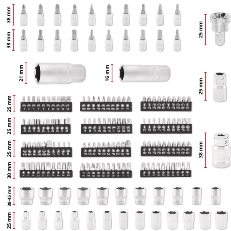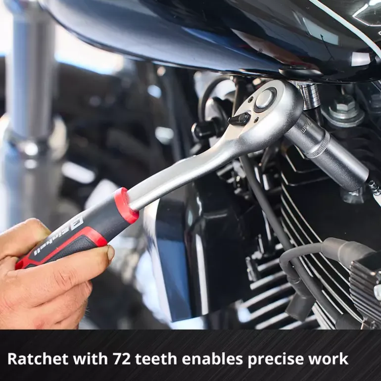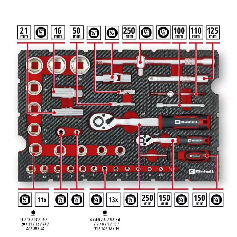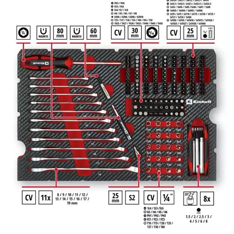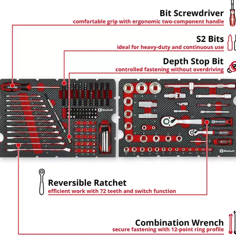 The 201-piece “Mechanics” tool case from the Einhell E-CASE system offers a comprehensive range of equipment for demanding assembly, maintenance and repair work in the home, garden, workshop and on vehicles. Included are sockets with 1/4″ and 1/2″ drive, ranging from 4 to 32 mm, made from high-quality chrome vanadium steel with a satin finish – ideal for securely tightening and loosening bolts and nuts. Two spark plug sockets, 16 mm and 21 mm in diameter, allow damage-free replacement of common spark plugs. The set is supplemented by chrome vanadium socket extensions in 1/4″ (50 mm and 100 mm) and 1/2″ (150 mm and 250 mm). Universal joints and T-handles with sliding bars make work in hard-to-reach areas easier. Two reversible ratchets with 72 teeth, 1/4″ and 1/2″ drive, made from 40Cr and CR-Mo steel, feature a switch mechanism, release button and ergonomic two-component grips – compatible with all sockets and bit sockets included in the set. Eleven combination spanners from 8 to 19 mm, made from chrome vanadium steel with a 12-point ring profile and satin finish, ensure powerful work without slipping. An 8-piece hex key set with ball ends, made from matt chrome-plated chrome vanadium steel, is suitable for screw connections in awkward angles. For controlled screwing, there is a 60 mm bit holder with a sturdy stainless steel sleeve and a telescopic bit holder extending from 80 to 120 mm for precise screw guidance. Also included are 90 bits in 25 mm length with 1/4″ C 6.3 shank, plus 30 bits with 5/16″ shank and 30 mm length, made from wear-resistant S2 steel. Bit sockets made from chrome vanadium steel with 1/4″ drive and 17 mm long S2 bits are designed for common profiles and high loads. The set is completed by a bit screwdriver with an ergonomic two-component handle and magnetic 1/4″ drive, as well as a nut driver made from satin-finished chrome vanadium steel. All tools are securely stored in a high-quality EVA foam inlay with a carbon look, protected in the lid by egg-crate foam. The impact-resistant plastic case with two latches belongs to the modular Einhell E-CASE system and is stackable, with a load capacity of up to 300 kg and a stacked load capacity of up to 1,000 kg. Folding handles, theft protection and a locking system ensure comfortable and safe transport.