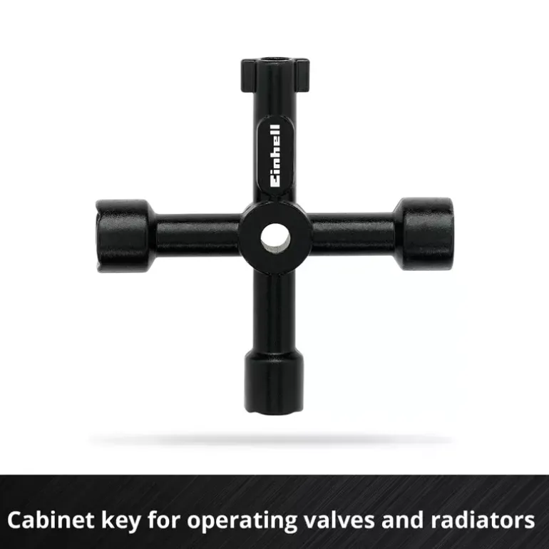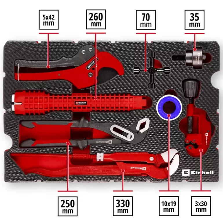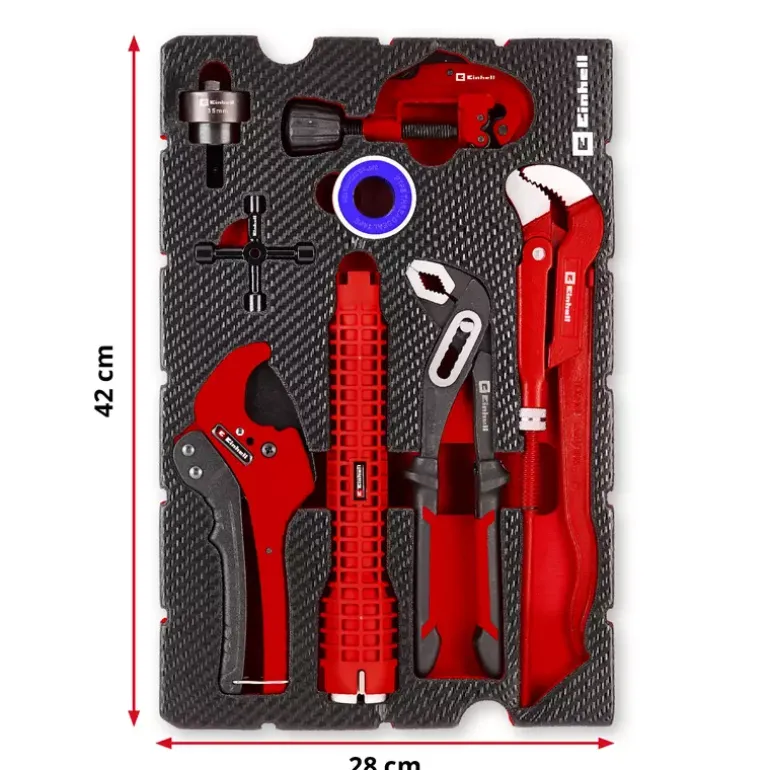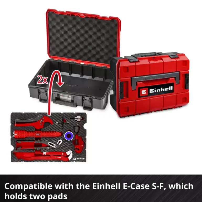 The 8-piece plumbing installation pad is part of the modular E-Case system from Einhell and offers a high-quality plumbing set for installing, maintaining and repairing pipes, fittings and sanitary connections. The 250 mm water pump pliers made of chrome vanadium according to DIN ISO 8976 feature an adjustable jaw width and provide a secure grip on various sizes of nuts and pipes. Also included in the plumbing installation set is a forged 45° offset pipe wrench with an S-jaw made of chrome vanadium, enabling powerful work even in tight corners and confined spaces thanks to its curved design. For precise and burr-free cuts in copper, aluminium or thin-walled steel pipes up to 30 mm, a pipe cutter made of zinc alloy with a hardened cutting wheel, integrated deburrer and practical quick-release function is included. Plastic pipes made of PVC, PP or PE can be reliably cut using the PVC pipe cutter made of aluminium and nylon. A highlight is the multifunctional sink wrench made of polypropylene with aluminium insert. Thanks to its 360° rotation function, long handle and non-slip mesh-design grip, this multifunctional basin wrench is ideal for installing angle valves, hose connections, fittings and sinks in tight, hard-to-reach areas. It also features a U-slot, allowing flexible hoses to be enclosed without dismantling them during installation. The robust cabinet key made of zinc alloy is suitable for opening, closing and operating common fittings and supply systems. It also serves as a radiator valve key, making it ideal for professionally bleeding radiators. A hole punch made of 40Cr steel enables precise 35 mm cut-outs in stainless steel sinks when no pre-drilled tap holes are available. The ten-metre-long insulating tape with a width of 19 millimetres is used to seal electrical or sanitary connections in wet areas. The plumbing set is neatly and securely stored in a rigid EVA pad with a carbon look, which is precisely tailored to fit the E-Case S-F and can be customised with up to two pads. This makes the plumbing installation set ideal for installing, loosening and sealing fittings, plastic and PVC water pipes, as well as for professionally bleeding radiators.