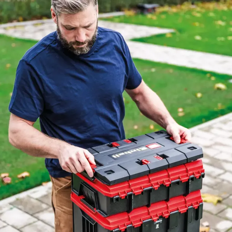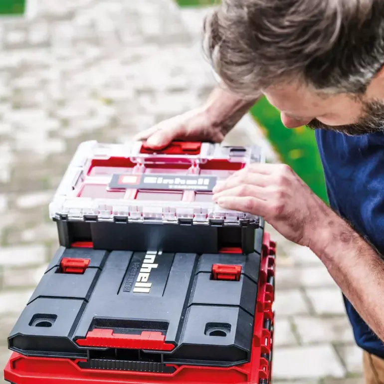 The Original Einhell E-Case adapter plate is part of the modular Einhell E-Case system. The adapter plate serves as a connector between Einhell E-Cases (without Half Size lock) and Einhell Half Size E-Cases for safe and easy combination. Equipped with our practical locking system, boxes and system cases can be fixed on the adapter plate and thus transported safely. The additional integrated lock can be used to mount half-size system cases on the plate, too. The adapter plate made from polypropylene, making it heat- and impact-resistant. With its four holes, the mounting plate can also be attached to the wall or the floor with M8 hex screws. The plate has a payload of max. 25 kg. Mounted on an E-Case or on the floor, the adapter plate can be loaded with up to 300 kg. One Einhell E-Case adapter plate is included. Other components, such as the E-Case Tower, are available separately.