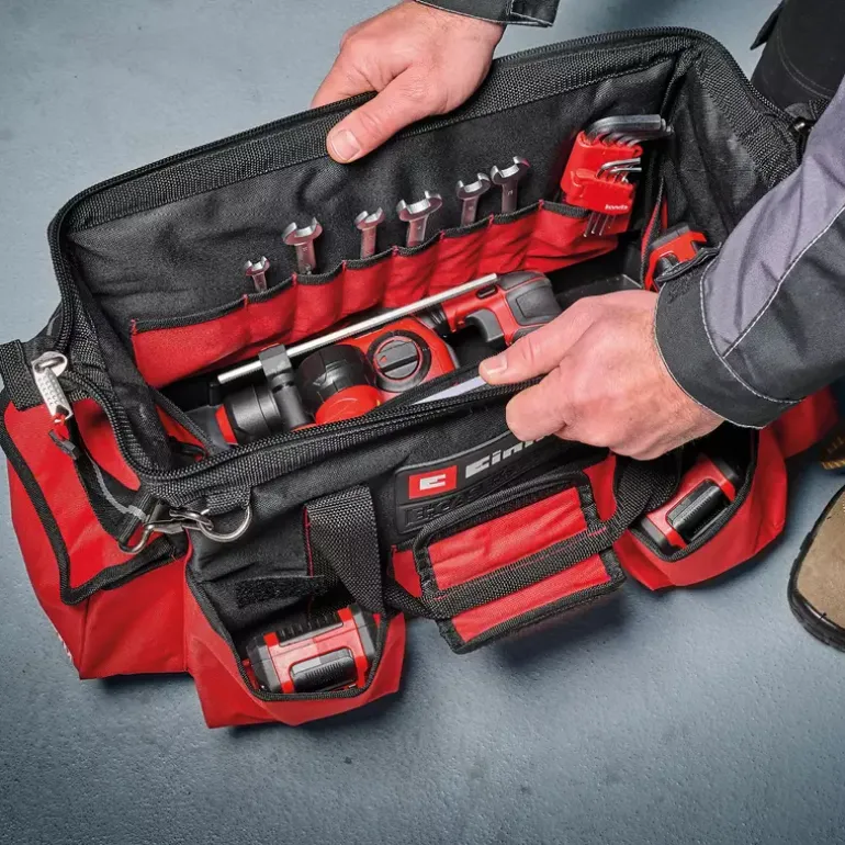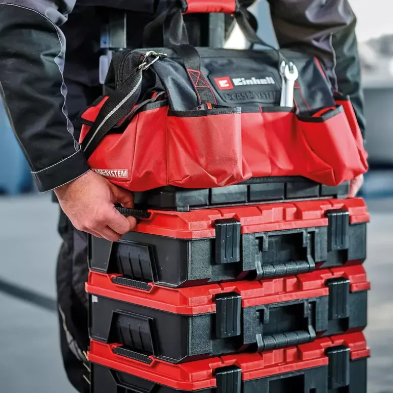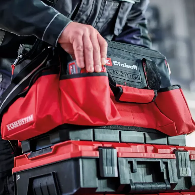 The original Einhell E-Case Bag is part of the modular E-Case system from Einhell. The bag is ideal for storing and transporting equipment, tools and accessories up to a maximum of 30 kg. A convenient latching system to connect stacked boxes and cases ensures tidy storage and enables safe transport. Featuring 6 large external pockets for items such as batteries and charging devices, and various inside pockets for hand tools such as screwdrivers, the system bag provides plenty of space for all kinds of items. One of the larger inside pockets has a zip, providing a place to safely store a notepad or tablet. The carrying strap and the two handles make it easy to transport and comfortable to carry. In addition, the bag includes two clips for a spirit level on the outside. This product consists of an Einhell E-Case Bag with a support structure compatible with the Einhell E-Case system.