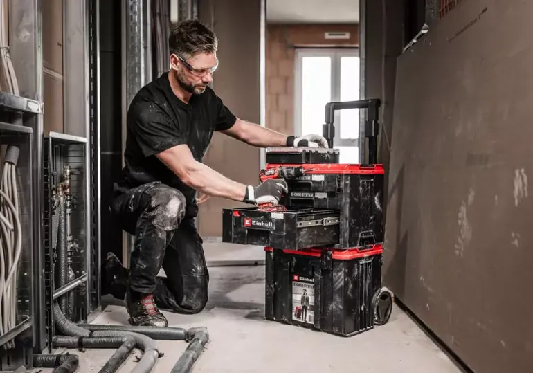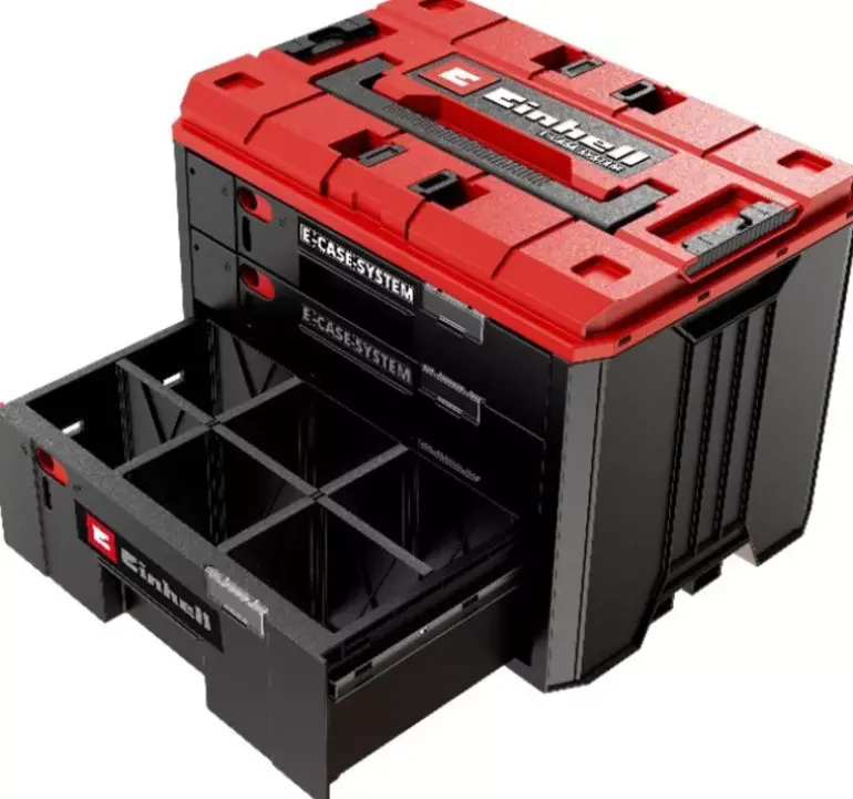 The Einhell E-Case drawer case is part of the modular E-Case system and keeps everything organised in each and every situation. The robust system case can be safely stacked and even combined with Half-size E-Cases thanks to the sophisticated locking system. It features three sturdy drawers: Two smaller drawers (height: 5.5 cm each) are perfect for screws, dowels or other small parts, while the large lower drawer (height: 12.5 cm) also provides space for power tools such as cordless screwdrivers or angle grinders. Each drawer can hold a weight of up to 20 kg. The case can withstand a total payload of max. 1,000 kg from above. The well-thought-out design offers quick and easy access to the contents: even when the case is stacked, the drawers can be opened comfortably. For maximum safety, all drawers are equipped with sliding locks, and the possibility of adding a padlock is built-in – ideal for secure transport and for preventing theft. Delivery includes 12 convenient sorting boxes with lids for the small drawers as well as a divider set for the large drawer. Transparent windows allow easy labelling of drawers. The large, ergonomically shaped carrying handle ensures comfortable transport even when carrying the maximum load of up to 60 kg.