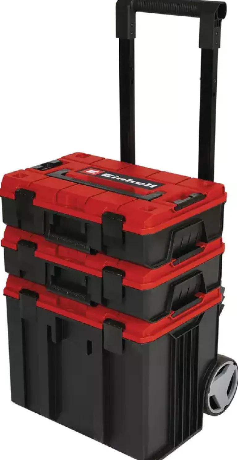 The Einhell E-Case Tower is part of the modular E-Case system from Einhell and is ideal for storing and transporting equipment, tools, accessories, and other items. A practical locking system for connecting stacked cases ensures systematic order during storage and enables safe transport. The cases are made of robust polypropylene, giving them high rigidity, heat resistance and impact resistance. The sturdy construction allows a total load of up to 120 kg. Equipment and tools can be easily transported, especially thanks to the extra-wide, telescopic handle. The large, rubberised wheels (Ø 15 cm) allow comfortable transport on any surface. Thanks to the intelligent design, the case is splash-proof and can be transported in any weather. The foldable and ergonomic handle ensures optimal wearing comfort, e.g. when taking it out of a car boot. The E-Case cases can be equipped with padlocks to secure them against theft. The E-Case Tower consists of three cases: The E-Case L includes a removable insert for hand tools. One E-Case S comes with a foam insert for safe transport without scratches, while the other includes a set of plastic dividers so you can transport small parts and accessories neatly. It also includes three stickers for labelling, so you will always know what is stored each case.