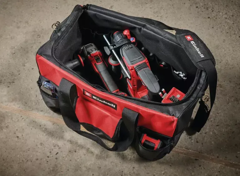 The Einhell bag 56/29 is handy, stable and always at hand: Tools and accessories from Einhell are safely stowed away, and even the Power X-Change battery and charger have their own place in the practical bag. The Einhell bag 56/29 is durable and robust and has a reinforced base – a real advantage if you want to tackle tough tasks indoors or outdoors. This means that the high-quality devices are well protected against adverse influences on the construction site, in the workshop or in the garden. The Einhell bag 56/29 may be loaded with up to 25 kg. The bag is 56 cm long, 29 cm wide and 30 cm high (external dimensions). The Einhell bag offers universal storage for various tools and accessories. Everything is quickly transported to the desired location with a handle. The carrying strap and the carrying handle are extremely handy. Thanks to the various pockets, the Einhell bag is always clearly arranged and the desired tool is quickly at hand.