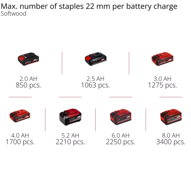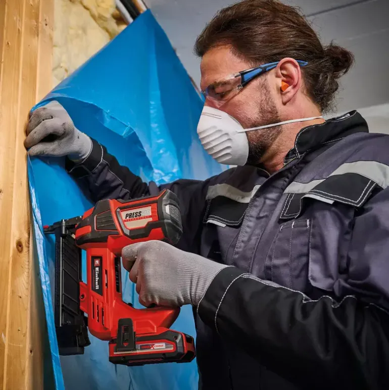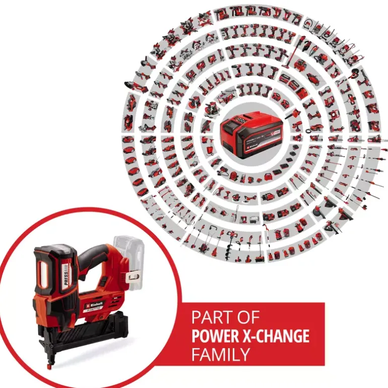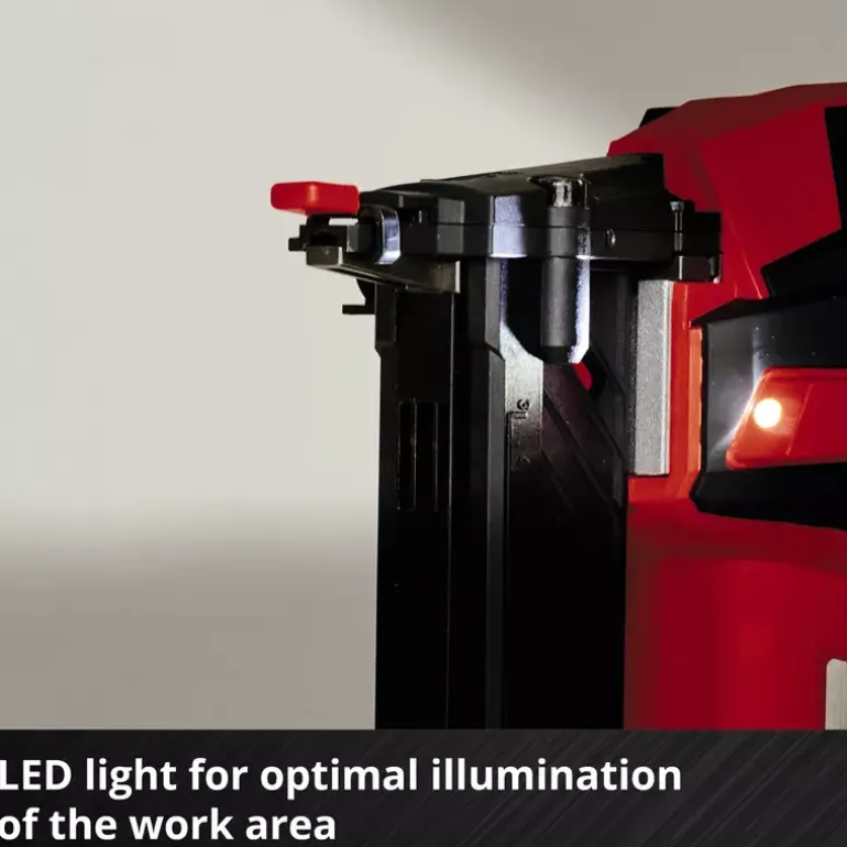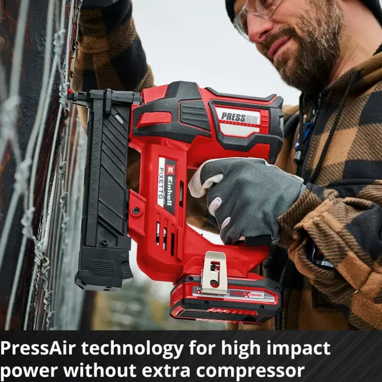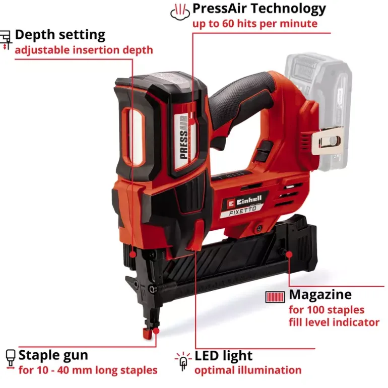 The Einhell Professional cordless stapler FIXETTO 18/40 S is a powerful helper when renovating and decorating. Whether when upholstering furniture, tacking wooden panels or attaching foils, tarpaulins or insulating materials – with the cordless stapler you can easily choose between single and series shot depending on the workload using the shot controller. As a member of the Power X-Change family, the FIXETTO 18/40 S can be combined with all batteries and chargers in the system family. The robust gearbox and the maintenance-free PressAir technology allow up to 60 impacts per minute, while the depth adjustment ensures a variable and exact staple insertion depth. The large magazine is equipped with a level indicator and has a maximum capacity of 100 staples. It can be easily opened and refilled at the push of a button. The cordless stapler can be used with 10–40 mm long and 15–5.7 mm wide staples. The slim design with rubberised side surfaces and ergonomic softgrip ensure comfortable handling. The LED lighting integrated on both sides of the housing ensures optimum illumination of the working area. Delivery includes practical belt clip for safe intermediate storage and 500 staples. The safety nose prevents accidental triggering of the stapler and thus protects against injury. The cordless stapler is delivered without a battery or charger, but these are available separately, for example as a practical starter kit.