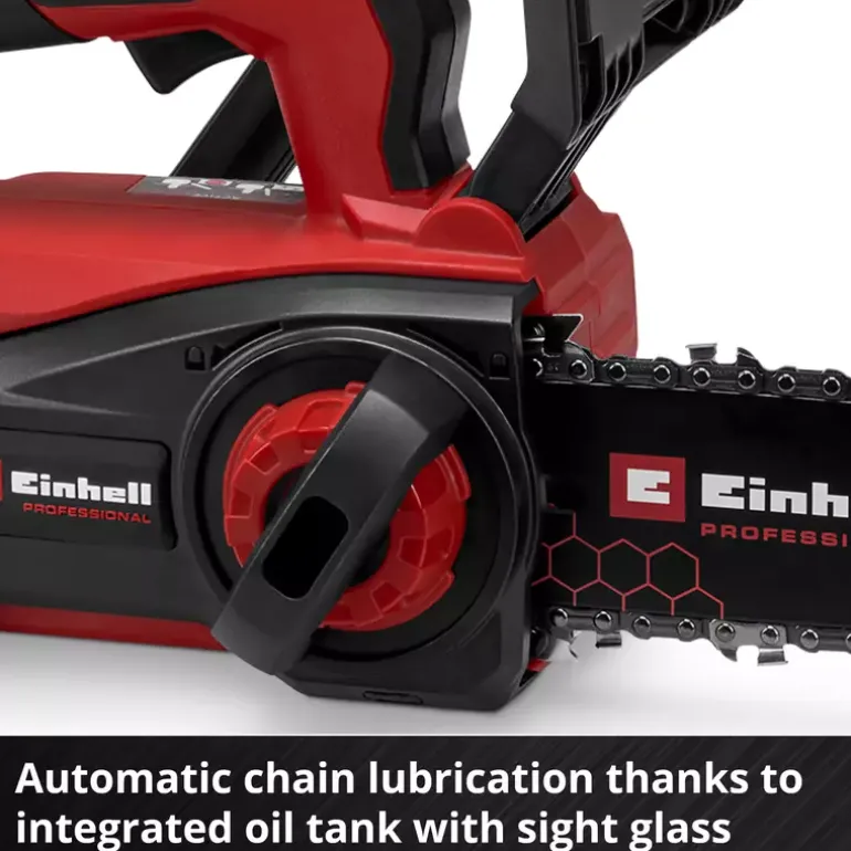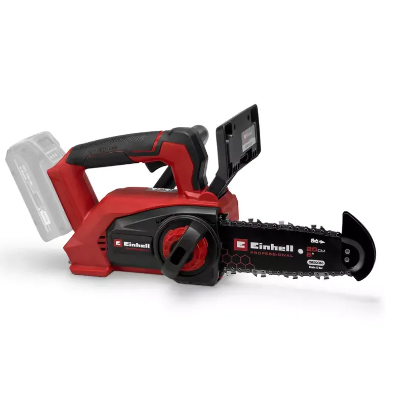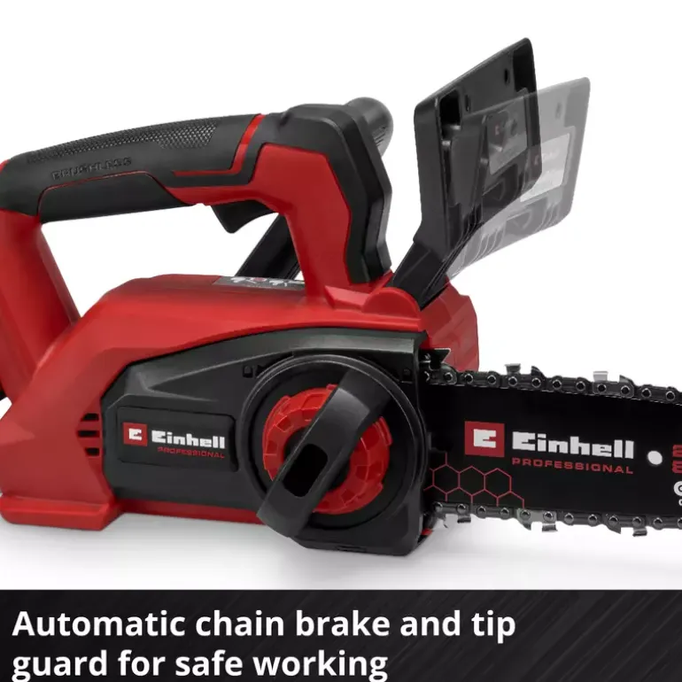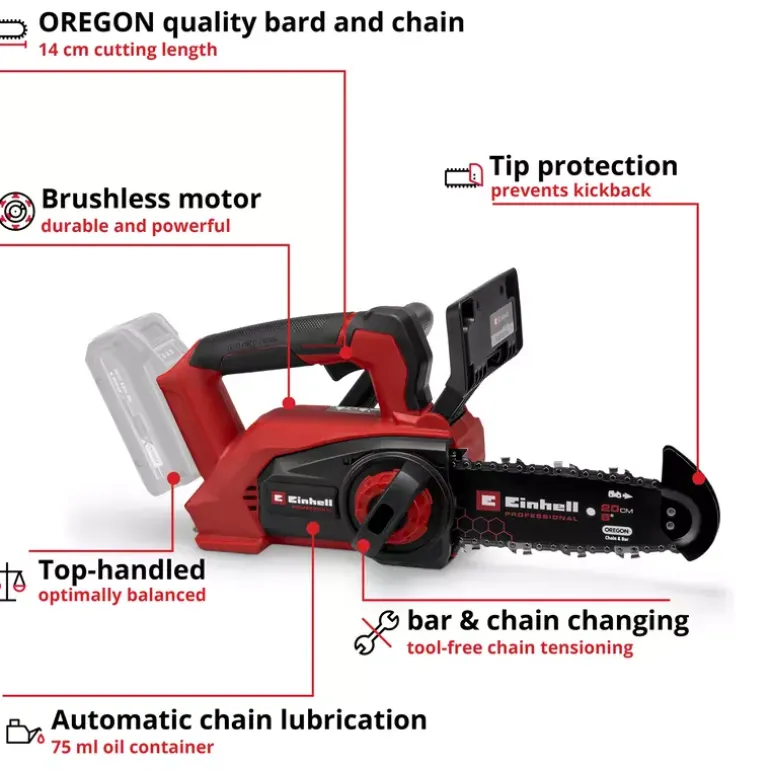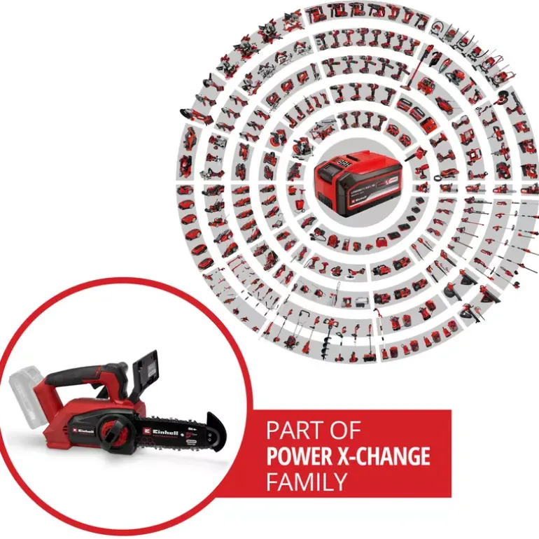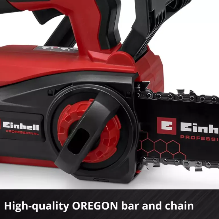 The Einhell handheld cordless chainsaw FORTEXXA 18/20 TH is a powerful member of the flexible Power X-Change family. The device is powered by the Einhell PurePOWER brushless motor. This brushless motor offers more power and a longer running time than conventional carbon brush motors. After registering online, the brushless motor comes with a 10-year warranty. Together with the OREGON quality blade and chain, even thick twigs and branches hardly have anything to do with FORTEXXA. The FORTEXXA has several safety mechanisms: a tip guard to prevent kickback, kickback protection with immediate chain brake and a chain safety bolt. A chain tension that can be adjusted without tools and an equally simple chain change make handling easier. The automatic chain lubrication ensures easy care via the large oil filling opening. The robust claw stop is made of metal, the ergonomic handle is equipped with softgrip for a firm and secure grip. 1x 18 V battery of the flexible Power X-Change series is required for operation, a 2.5 Ah battery or higher is recommended for optimal results. The innovative Power X-Change series from Einhell scores with strong performance and maximum flexibility: The lithium-ion batteries are interchangeable indefinitely among the devices of the Einhell system series. Any system battery can be used with any Power X-Change device. Delivery does not include a battery or charger, but these are available separately, for example as a practical starter kit in various thicknesses. WARNING: This chainsaw may only be used by qualified tree surgeons. Failure to comply with the safety and operating instructions can cause serious injury.