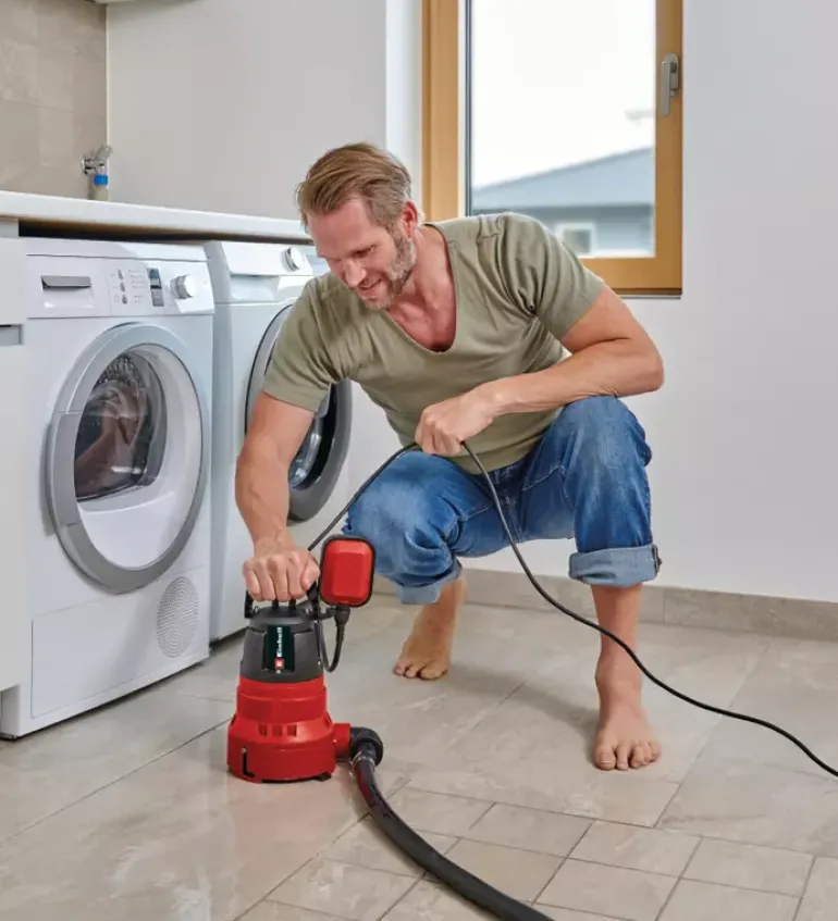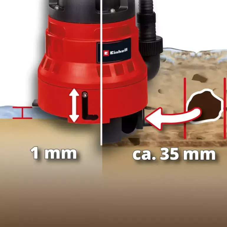 The Einhell dirt water pump GC-DP 7035 LL is an all-rounder if clear or dirt water is to be pumped out. The 2-in-1 combi pump works flat suction up to 1 mm residual water level, with dirt water up to 35 mm maximum foreign body size. The pump is started in clear water mode at a water height of 10 mm in continuous operation. The suction level can be adjusted by a simple rotary movement. The float switch is infinitely height adjustable. The high-quality ceramic/rubber mechanical seal ensures a long service life, and the housing is also made of impact-resistant plastic. A cable winding option is integrated on the housing. The ergonomic carrying handle allows easy transport. The suitable connection is provided by 90°angle G1½ (approx. 47.8 mm) AG x G1½ (approx. 47.8 mm) AG, a universal adapter for 25/32 mm hoses and 33.3 mm (G 1) AG.