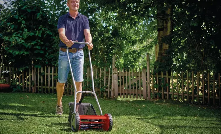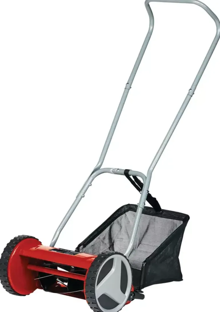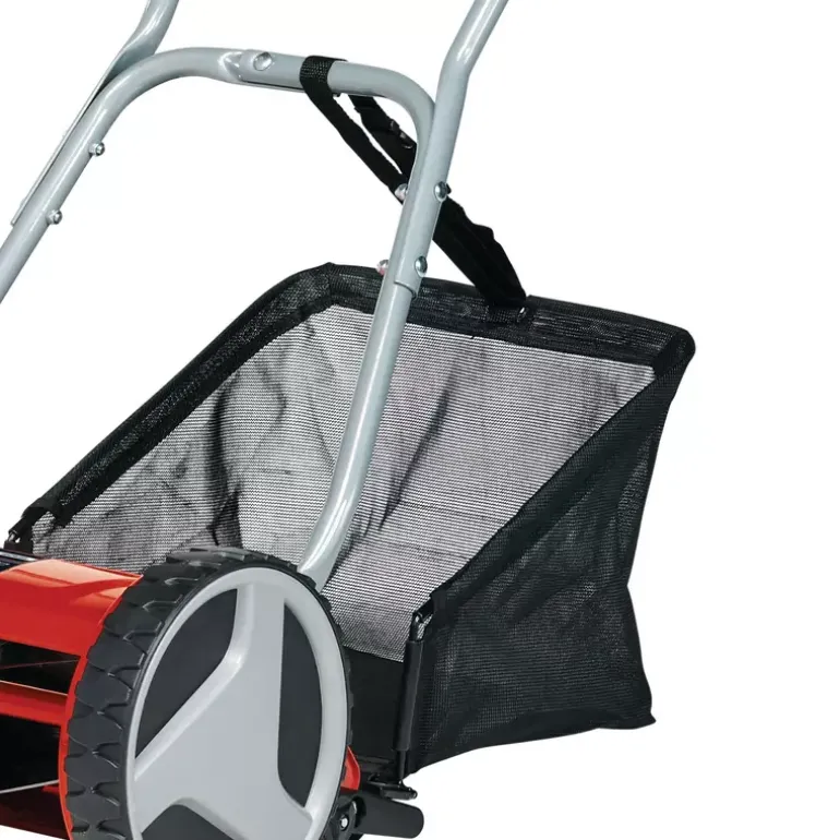 The Einhell GC-HM 300 cylinder lawn mower is a robust, functional lawn mower without a motor drive, for the clean, quiet and environment-friendly mowing of lawns of up to 150 m² in size. The ball-bearing mounted mower spindle with five high-grade steel blades is designed for a cutting width of 30 cm. The cutting height adjustment facility with 4 levels can be adjusted to individual requirements between 13 mm and 37 mm. The plastic roller has a diameter of 45 mm. The cylinder lawn mower has lawn-friendly large wheels. A curved long handle provides optimum on-the-job ergonomics, and there is a parking position for easy and secure storage of the lawn mower. The 16 liter grass catch basket is removable and easy to empty.