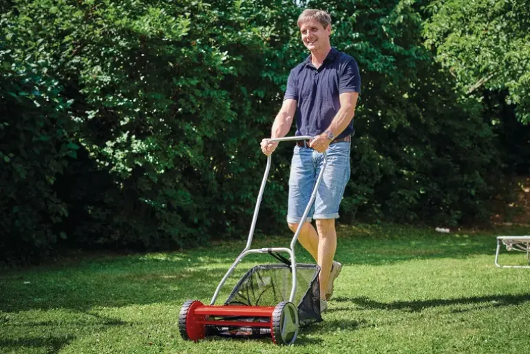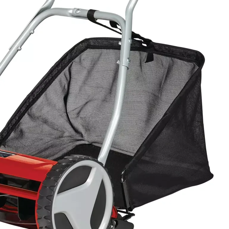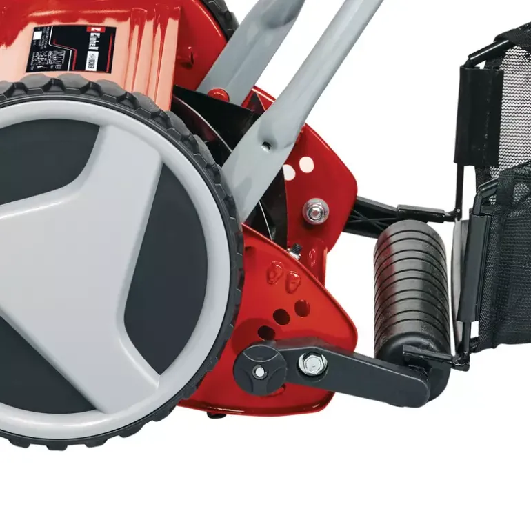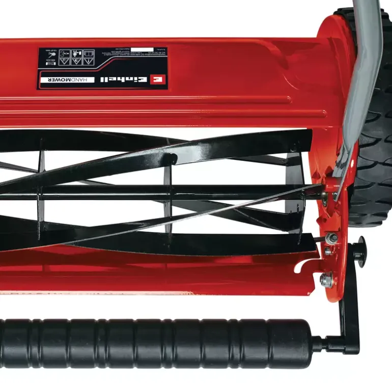 The Einhell GC-HM 400 cylinder lawn mower is a robust, functional lawn mower without a motor drive, for the clean, quiet and also environment-friendly mowing of lawns of up to 250 m² in size. The ball-bearing mounted mower spindle with 5 high-grade steel blades is designed for a cutting width of 40 cm. The cutting height adjustment facility with 4 levels can be adjusted to individual requirements between 13 mm and 37 mm. The plastic roller has a diameter of 46 mm. The cylinder lawn mower has lawn-friendly large wheels. A curved long handle provides optimum on-the-job ergonomics. There is a parking position for easy and secure storage of the lawn mower. The 27 liter grass catch basket is removable and easy to empty.