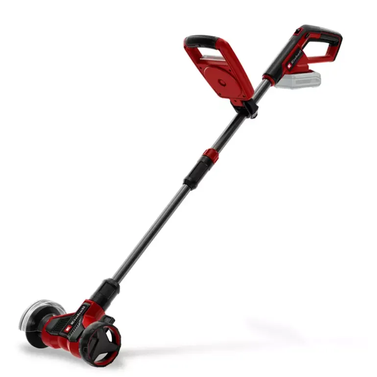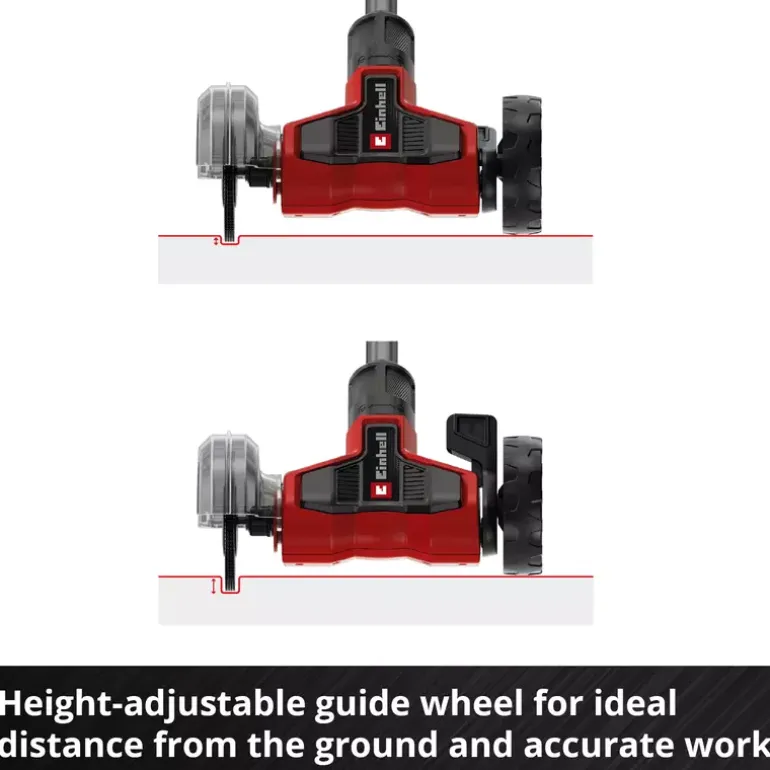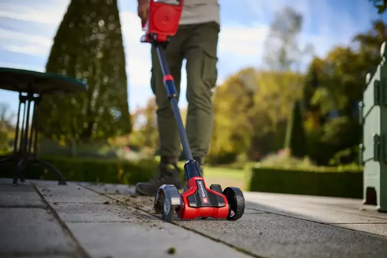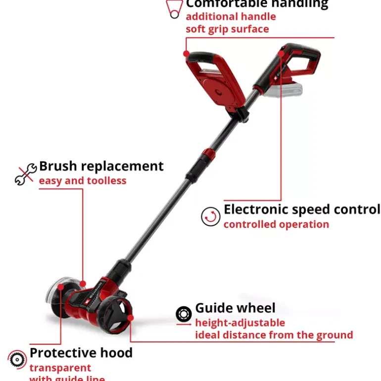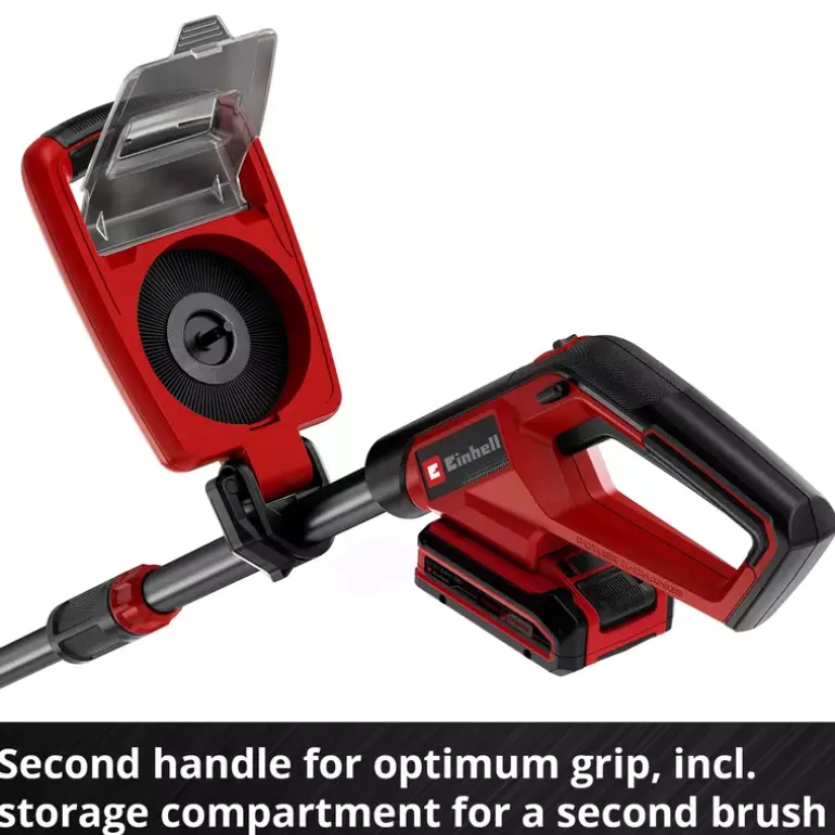 Whether moss, weeds or grass: With the Einhell cordless grout cleaner GE-CC 18/110 Li E-Solo, you can reliable clean grouts on your driveway or patio of dirt. As part of the Power X-Change family, this device features a powerful 18 V battery for cordless cleaning. Equipped with a 2-point safety switch and electronic speed control, you can work safely and as is appropriate for your material. So you can always maintain the ideal distance from any grouting, the guide wheel can be adapted to any grouting depth without tools. This way, the grout scraper always remains parallel to the grouting brush and allows for precise operation at constantly the same height as the wheel. The transparent splash guard protects against dust and dirt, is adjustable at an angle and equipped with a clearly visible guide line for precise cleaning work. The telescopic guide bar and adjustable additional handle with soft grip surface with integrated brush storage compartment make for ergonomic handling. The cordless grout cleaner is supplied with a 10 mm wide nylon brush for scratch-sensitive surfaces and a 15 mm wide steel brush for powerful weed removal on rugged surfaces. Both brushes have a 110 mm Ø each and can be replaced without tools. The Einhell cordless grout cleaner GE-CC 18/110 Li E-Solo is supplied without a battery or charger. These are available separately.