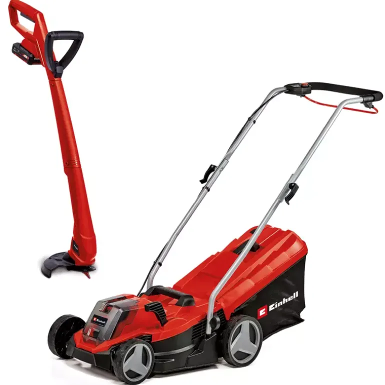 The Einhell cordless garden equipment set GE-CM 18/33 Li + GC-CT 18/24 Li P can be used to upgrade your own garden in a simple and cable-free way. The set consists of the Einhell cordless lawn mower GE-CM 18/33 Li, the Einhell cordless lawn trimmer GC-CT 18/24 Li P, a 4.0 Ah Power X-Change battery and a charger. Thanks to Power X-Change technology, lawn mowers and lawn trimmers work with a powerful 18V lithium-ion battery that can be used in all Einhell devices in the system range. The cordless lawn mower is recommended for lawn areas up to 200 m². The lawn mower is powered by an Einhell PurePOWER brushless motor. This brushless motor offers more power and a longer running time than conventional carbon brush motors. Once you register online, the brushless motor has a 10-year warranty. The highwheeler with large, grass-friendly wheels has a 5-stage central cutting height adjustment as well as a 2-stage height-adjustable and foldable guide rail for comfortable operation and a generously dimensioned grass collection basket with level indicator. The mower is equipped with a high-quality, impact-resistant plastic housing and, moreover, with an integrated carrying handle, with which it can be easily transported. The cordless lawn trimmer GC-CT 18/24 Li P effortlessly trims lawn edges, grass strips and tight spots in the garden. Thanks to the additional handle, the lawn trimmer can be operated comfortably with two hands. In the design of the housing and additional handle, emphasis was placed on durability, they are made of impact-resistant, high-quality plastic. With up to 8,500 rpm, the cordless lawn trimmer works powerfully at a cutting width of up to 24 cm. In addition to the 4.0 Ah battery and charger, delivery also includes 20 plastic blades.