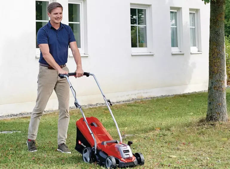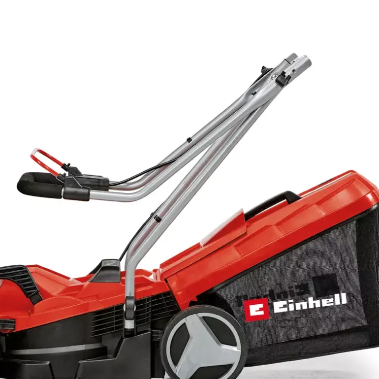 The Einhell cordless lawn mower GE-CM 18/33 Li has a cutting width of 33 cm. Its grass collection basket made of high-quality plastic holds 30 litres and is perfect for smaller garden areas. The cutting height can be centrally adjusted in 5 steps between 25–65 mm.