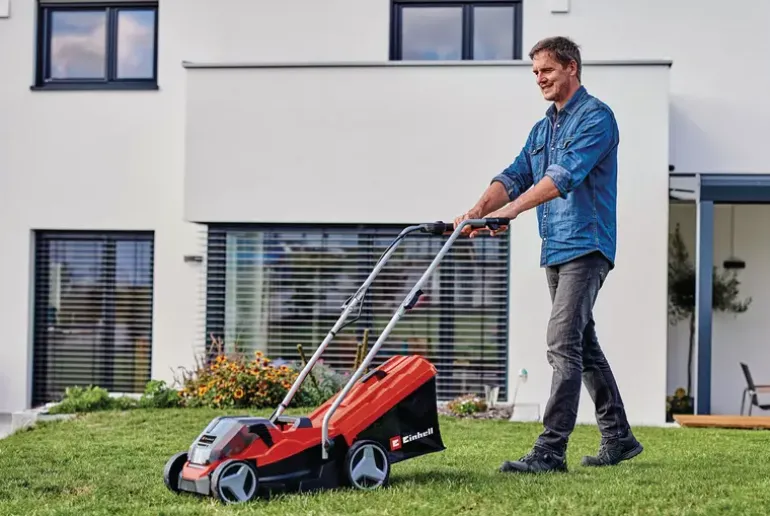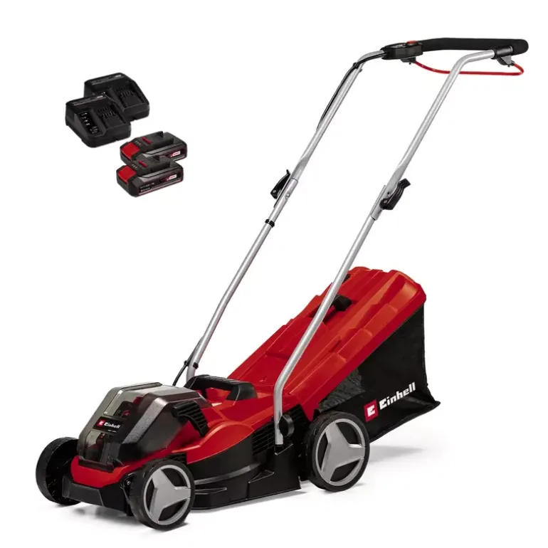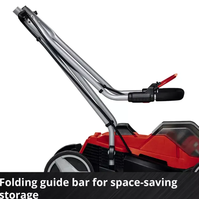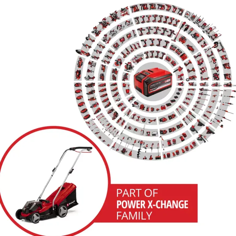 The battery-powered lawn mower GE-CM 36/33 Li is a very high quality, reliable and extremely high performance equipment for the cordless care of smaller lawn surfaces. By means of the new Power X-Change battery system from Einhell, the lawn mower has two powerful 18 V batteries with respectively 2.5 Ah, for pleasant operations without an annoying power cable. The five-stage central cutting height adjustment permits the simple, individual adjustment of the cutting height. The GE-CM 36/33 Li is equipped with a foldable push handle with high-speed clamping levers and can be adjusted in height. Each battery has a battery filling level display with three LEDs, from which the current charging state can be read at one glance. The batteries can additionally be used for all devices of the Power X-Change family. The scope of delivery additionally includes two system battery chargers. Its large-area wheels additionally preserve the lawn. The large grass box is equipped with a filling level display, so it can be seen immediately, if emptying is necessary. The long-lasting housing consists of high-quality, impact-resistant plastics. A practical carry handle provides a simple transport. The GE-CM 36/33 Li is recommended for lawns up to 250 m².