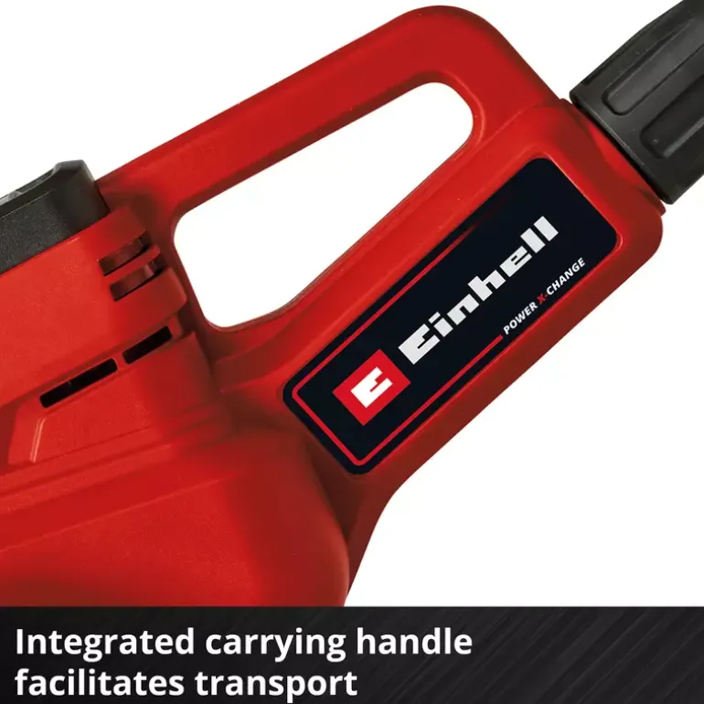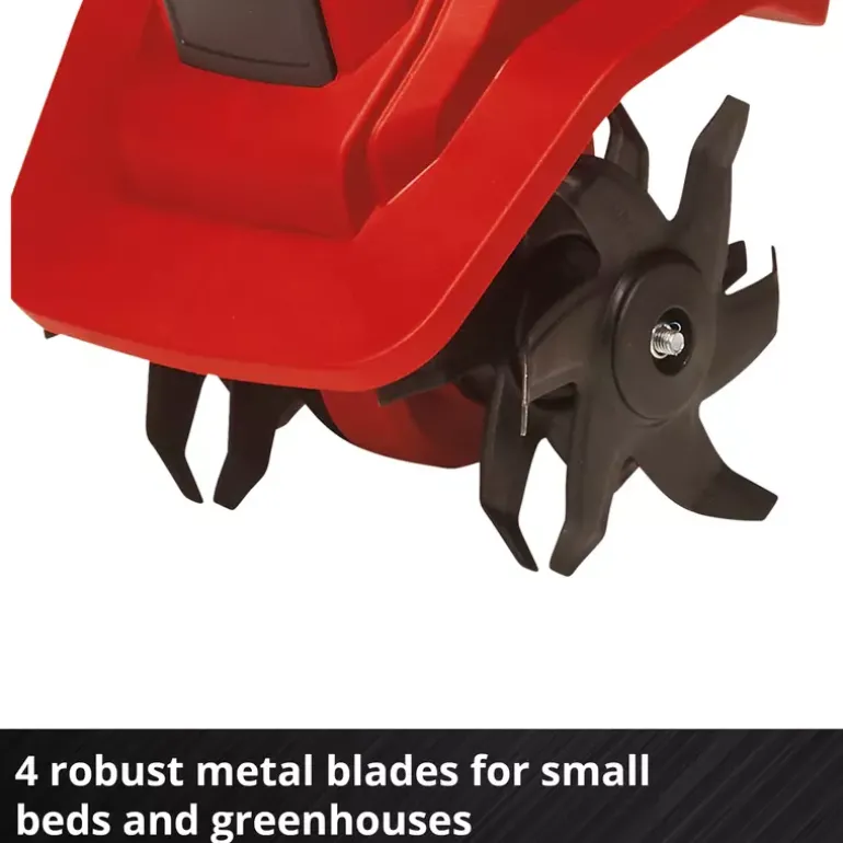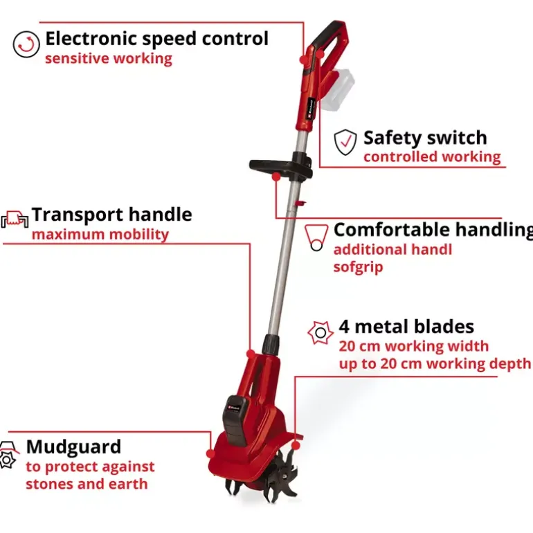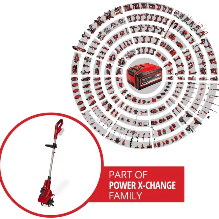 The Einhell cordless ground tiller GE-CR 18/20 Li E – Solo offers cordless freedom for easy, light soil loosening. It is a member of the Power X-Change family, where the batteries of the system series can be used in more than 200 Einhell devices. When getting your garden flower beds and greenhouses ready or loosen up the top layer of soil in strength-saving way, the cordless garden tiller offers a wide range of applications. The electronic speed control also ensures increased flexibility. The four heavy-duty blades are made of metal and guarantee a long service life. Comfortable and fatigue-free work are guaranteed by the light weight and main handle with softgrip. The additional handle can also be used to adjust the handle position individually for the user. The transport handle allows maximum mobility. The separable guide bar ensures space-saving storage. Delivery does not include battery or charger. These are available separately, e.g. as a practical starter set from Einhell.