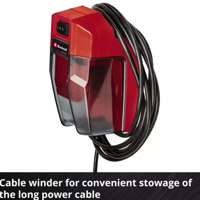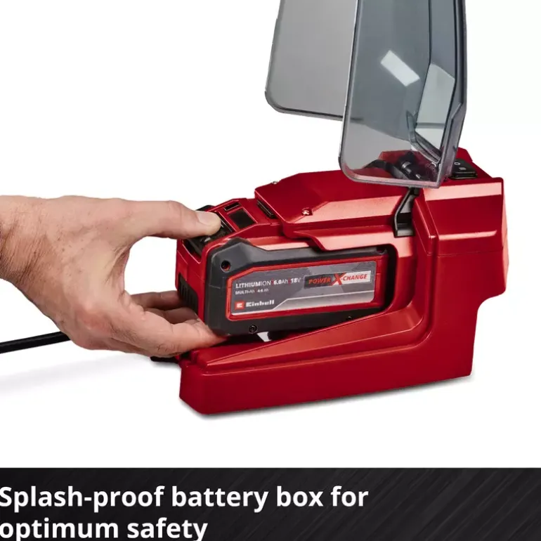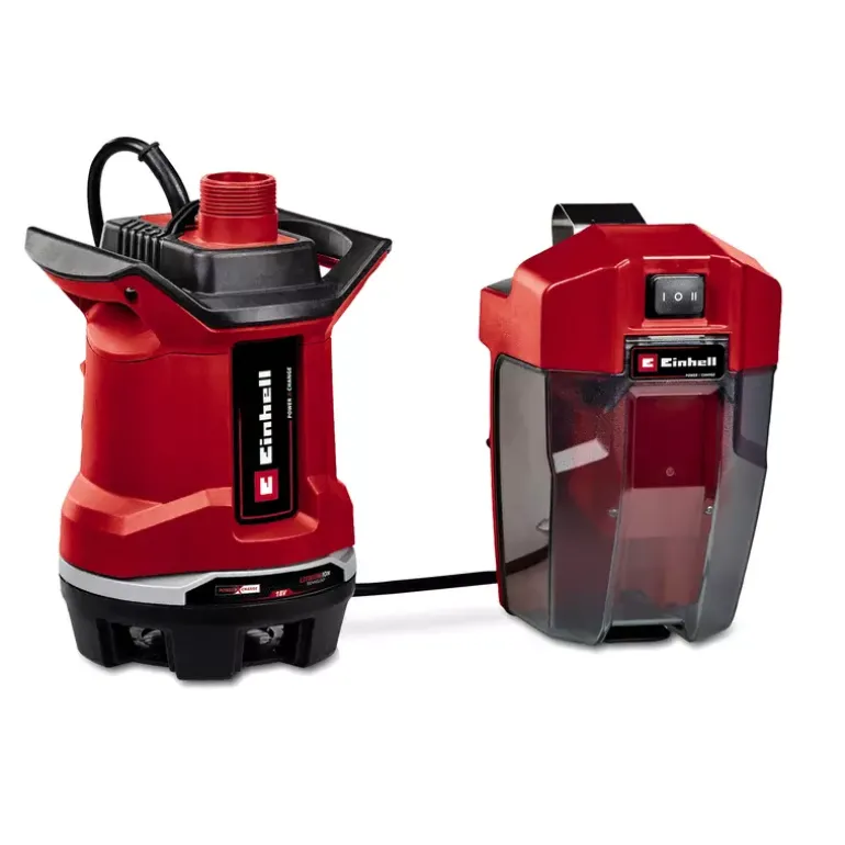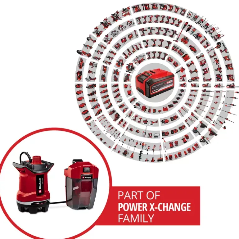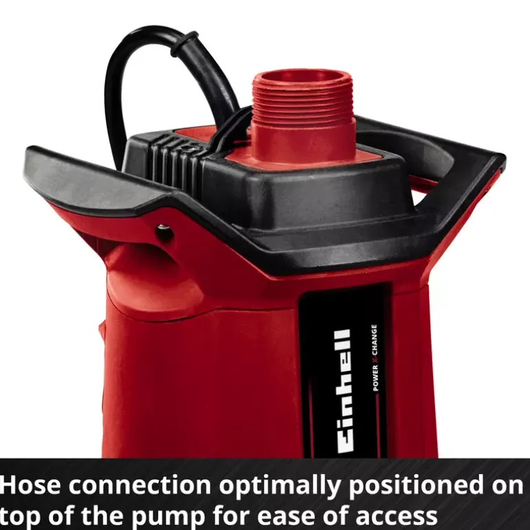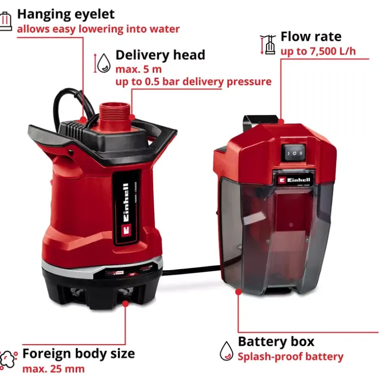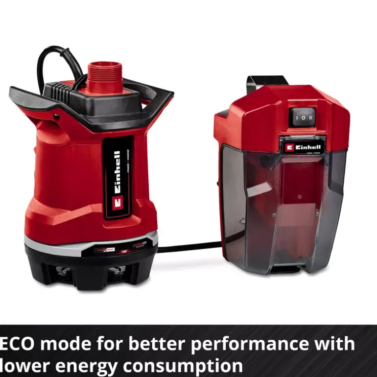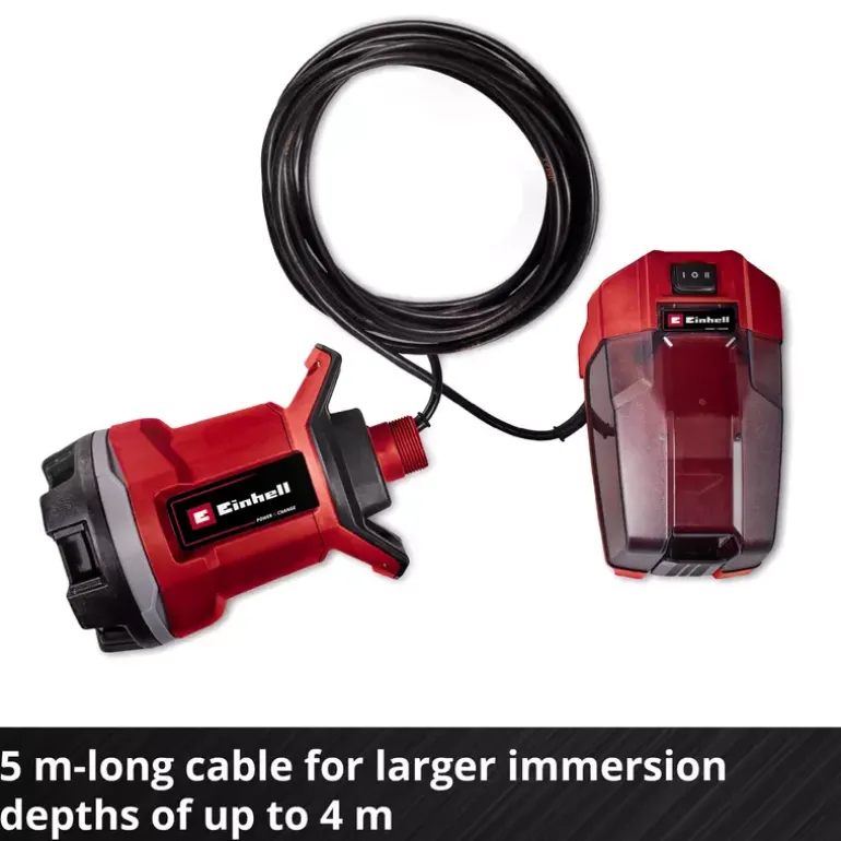 The Einhell cordless waste-water pump GE-DP 18/25 Li is an all-rounder for pumping out clean or waste water. The powerful pump is part of the Einhell Power X-Change family, where all batteries, system devices and chargers can be flexibly combined. Thanks to its battery, the waste-water pump can be used flexibly, regardless of a power connection. The battery is protected by the splash-proof, robust battery box and can be hung on walls, rain barrels, fences, etc. thanks to the wall bracket and fastening hooks. A cable holder for the 5-metre-long connecting cable, which allows the pump to immerse up to 4 metres deep is integrated into the battery box. The 153 W motor enables a max. delivery capacity of 7,500 litres per hour with a max. delivery pressure of 0.5 bar. The pump has two power levels: The ECO mode ensures longer running times with less battery consumption, whereas the BOOST mode provides the maximum output. The cordless pump is suitable for water with maximum 25 mm dirt particles. To start the pump, the water level must be at least 40 mm; the powerful pump can pump down to a residual water level of 35 mm. The double-sided carrying handle allows easy transport. The pump is equipped with a 42 mm (1 1/4″ AG) pressure connection and is supplied with a universal adapter for 25/32 mm hoses with 1″ AG (33.3 mm). The cordless waste-water pump GE-DP 18/25 Li is supplied without a battery or charger. These are available separately.