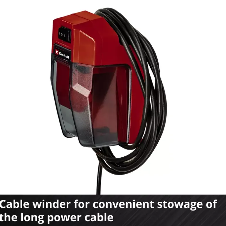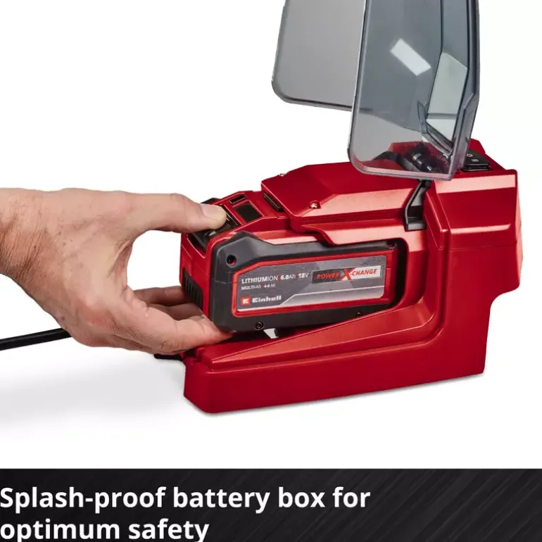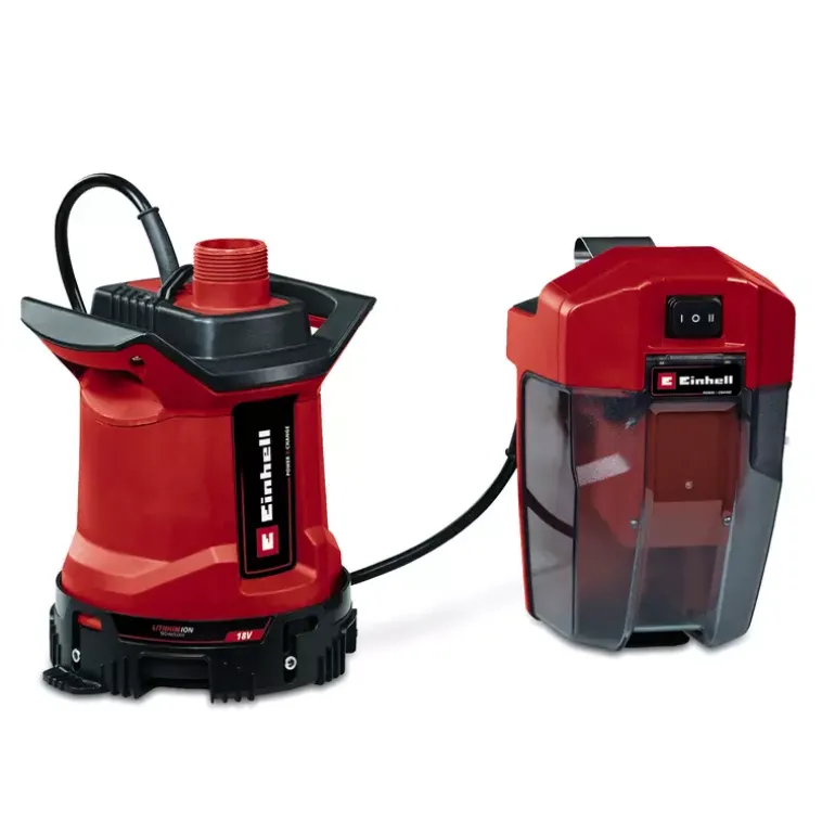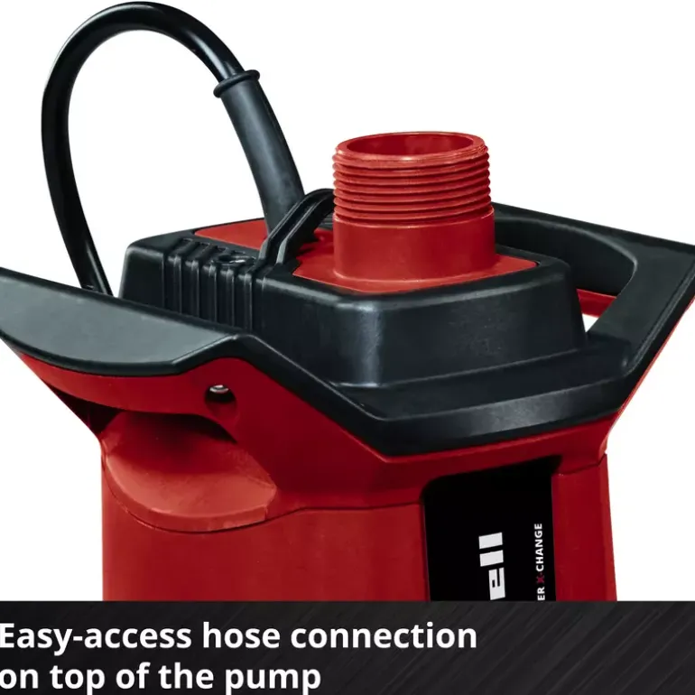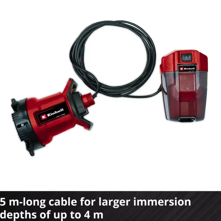 The flat-suction Einhell cordless waste water pump GE-DP 18/25 LL Li-Solo is an all-rounder for pumping out clean or waste water. The powerful water pump is part of the Einhell Power X-Change family, where all batteries, system devices and chargers can be flexibly combined. Thanks to the battery, the waste water pump can be used flexibly, regardless of a power connection. The battery is protected by the splash-proof, robust battery box and can be hung on walls, rain barrels, fences, etc. thanks to the wall bracket and fastening hooks. A cable holder for the 5-metre-long connecting cable, which allows the pump to immerse up to 4 metres deep is integrated into the battery box. The 160W motor allows the pump to deliver up to 7,000 litres per hour at a maximum pressure of 0.5 bar. The submersible pump has two power levels: The ECO mode ensures longer running times with less battery consumption, whereas the BOOST mode provides the maximum output. Thanks to the rotatable housing bottom, the cordless pump is suitable for both waste water with maximum 25 mm dirt particles and clear water (1 mm grain size). Clean water can be pumped out with the flat suction pump up to 1 mm residual water level. When starting the pump, the water level must be at least 10 mm. A double-sided carrying handle makes it easy to transport the 3.3 kg lightweight device. The pump is equipped with a 42 mm (1 1/4″ AG) pressure connection and is supplied with a universal adapter for 25/32 mm hoses with 1″ AG (33.3 mm). The cordless waste water pump GE-DP 18/25 LL Li-Solo is supplied without a battery or charger. These are available separately.