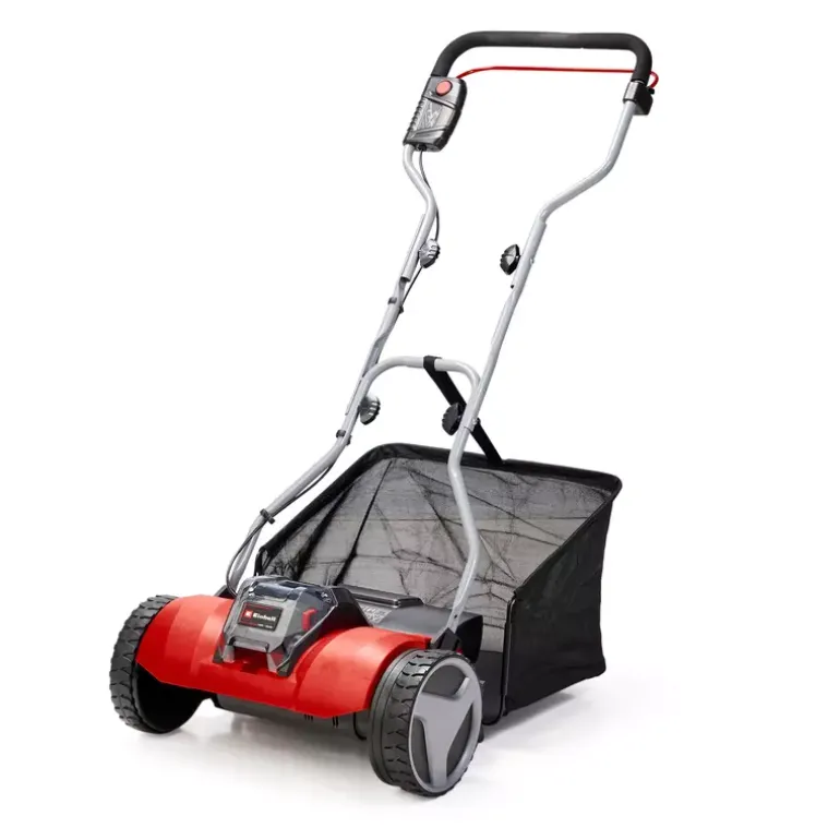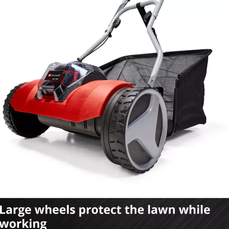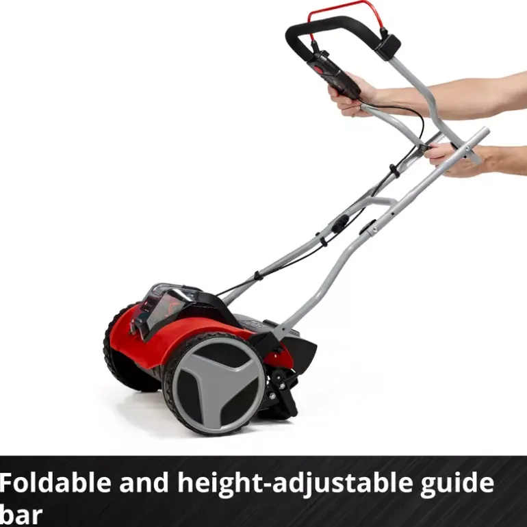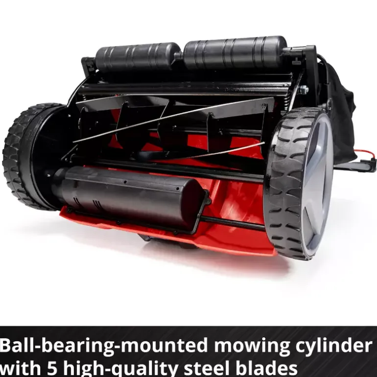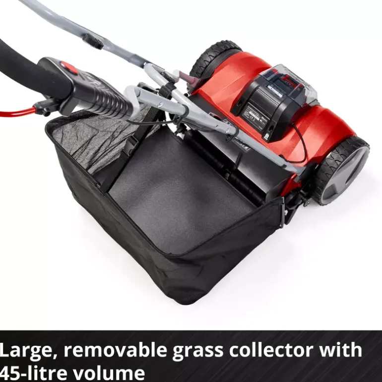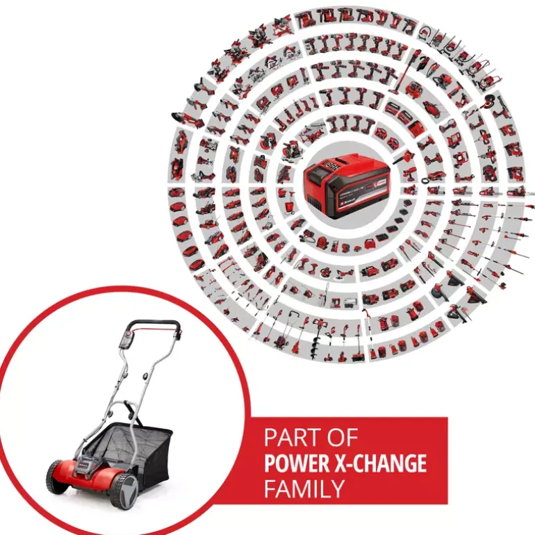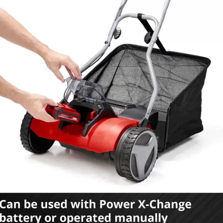 The Einhell GE-HM 18/38 Li-Solo cordless lawn mower has precision-ground blades made of high-grade steel for cutting results in the home garden that are “suitable for golf putting greens”. As a member of the flexible, high-performance Power X-Change family, the lawn mower is powered by an 18 V rechargeable battery from the high-grade lithium-ion system series. Power X-Change offers not just cordless freedom but practical flexibility as well: Every rechargeable battery from the system series can be combined with every PXC device, just as every PXC charger is compatible with every rechargeable battery. Moreover, the lawn mower can also be used in manual mode, in other words without the power of the Power X-Change battery. Driven by the ball-bearing mounted cylinder with five high-quality steel blades, the cordless lawn mower makes use of a contact-free, low-noise and power-saving cutting system. The 4-level cutting height adjustment facility can be set to 14 mm, 23 mm, 32 mm or 38 mm. The cordless lawn mower has large wheels. The ergonomic, height-adjustable long handle can be adjusted to individual requirements to make it easier and more comfortable to use. The generously dimensioned grass catch basket with a volume of 45 liters is detachable. This product comes without a battery and without a charger which are available separately, e.g. as a practical starter set.