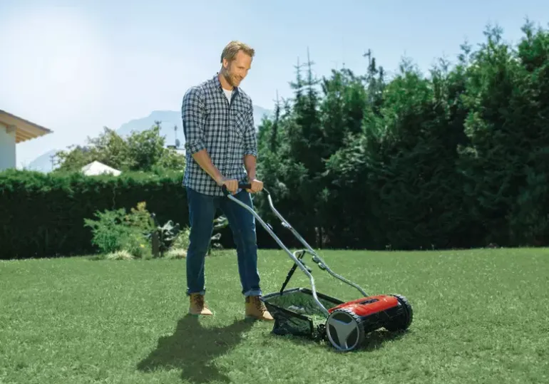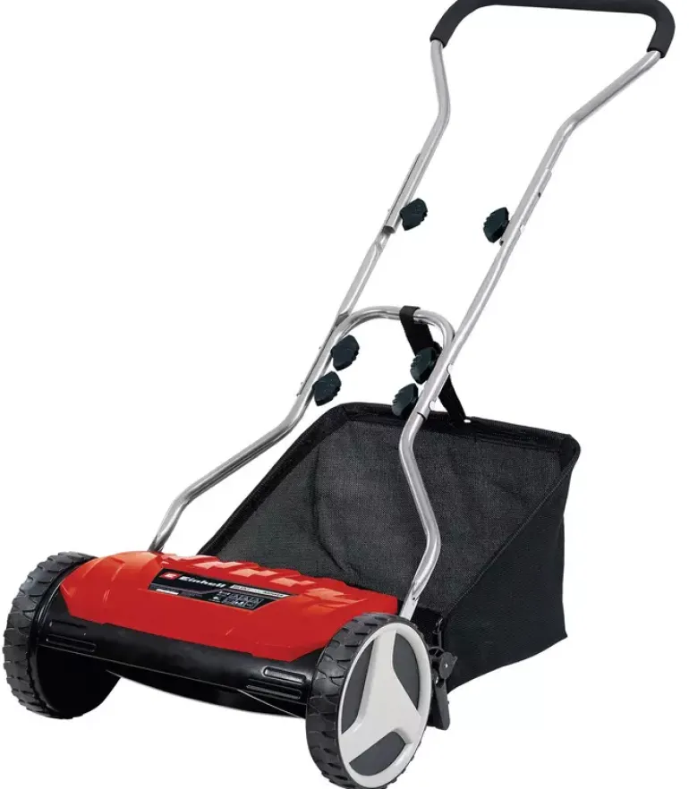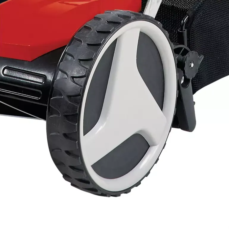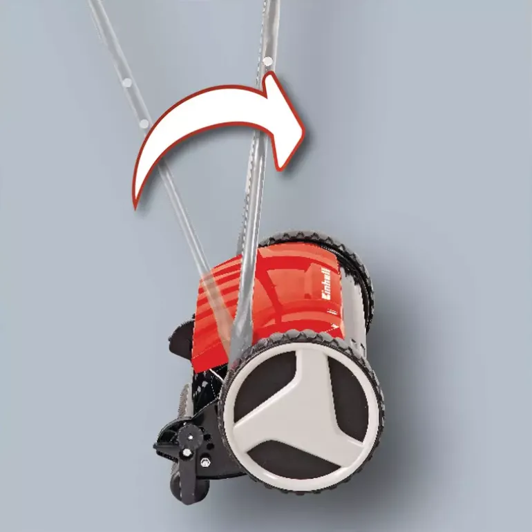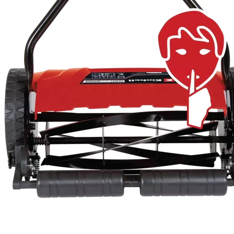 The GE-HM 38 S-F manual lawn mower is a robust and functional tool for any home gardener, suitable for quietly and efficiently mowing smaller lawn areas. Its special contact-free cutting technology makes mowing easier, as only minimal friction occurs between the blade and the counter blade. This reduces both the required effort and the noise level. The grass blades are cut deeply and cleanly, creating a fine lawn appearance, almost like being cut with scissors. This high-quality cylinder mower features a smooth-running, ball-bearing-mounted cutting spindle with five precision-ground blades made of quality steel. Thanks to the four-level cutting height adjustment, the cutting height can be precisely adapted. The cutting system of the GE-HM 38 S-F even allows results described as “golf-course suitable.” In addition, the lawn mower is equipped with large wheels and a plastic roller (Ø 50 mm) for even movement across the lawn surface. The grass catcher has a capacity of approx. 26 litres. This device is recommended for lawn areas of up to 250 m².