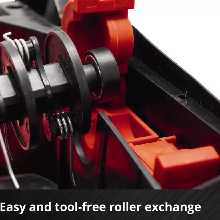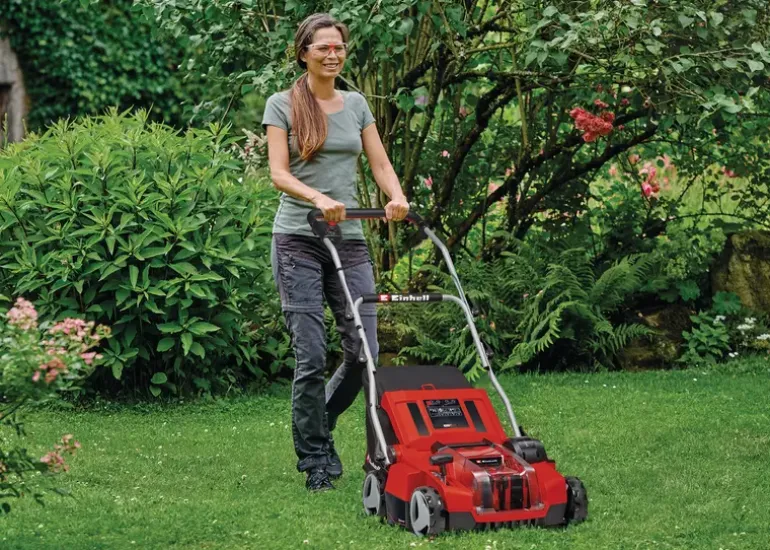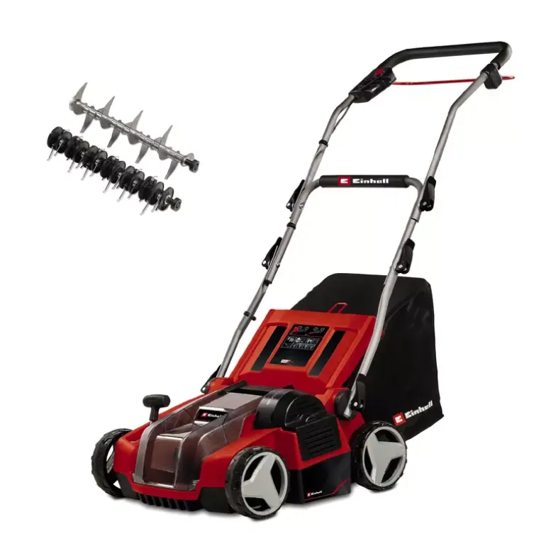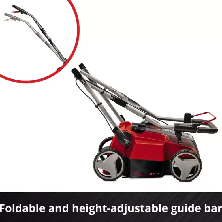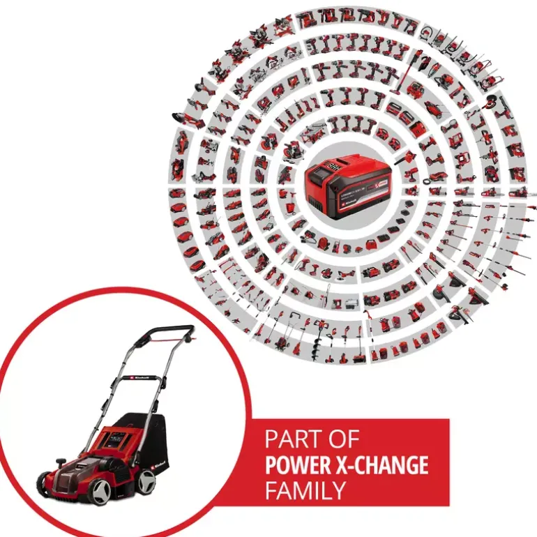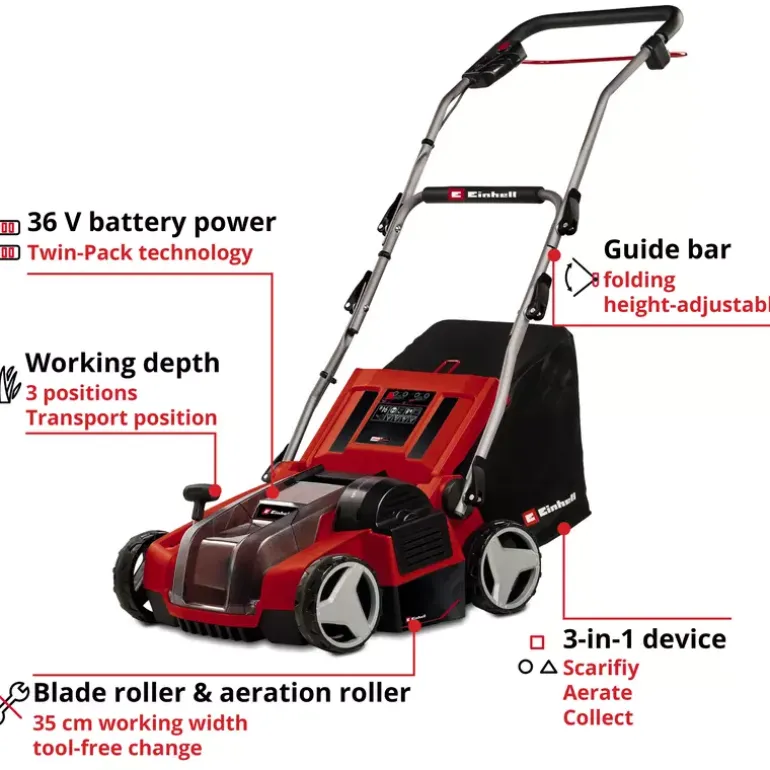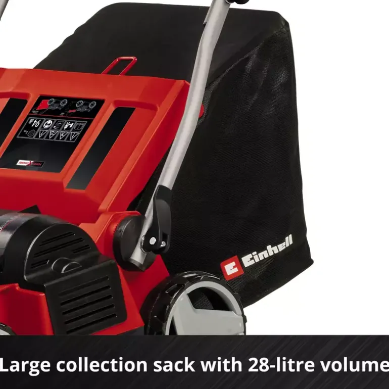 The Einhell cordless scarifier fan GE-SA 36/35 Li-Solo ensures impeccable greenery in your home garden. Thanks to the Power X-Change drive, there is cordless freedom and lawn care is possible in every corner of the garden. The TWIN-PACK technology uses the power of two 18 V PXC batteries. The device is powered by the Einhell PurePOWER brushless motor. This brushless motor offers more power and a longer running time than conventional carbon brush motors. After registering online, the brushless motor comes with a 10-year warranty. The well designed 3-in-1 combi device enables scarifying, ventilation and catching. The ball-bearing blade roller works its way into the grass sward with 16 robust stainless steel blades. The ball-bearing fan roller is equipped with 24 claws. The 3-stage central working depth adjustment with additional transport position allows comfortable working. The foldable and height-adjustable guide rail is equipped with a quick-release lever and includes a parking position. A carrying handle is also integrated. The wheels have a large and are therefore gentle on the lawn. The large collection sack has a volume of 28 litres. The roller can be changed without tools. The plastic housing made of impact-resistant material is designed to be easy to maintain. 2×18 V batteries are required for operation. Delivery does not include a battery or charger, but these are available separately, for example as a practical starter kit from Einhell.