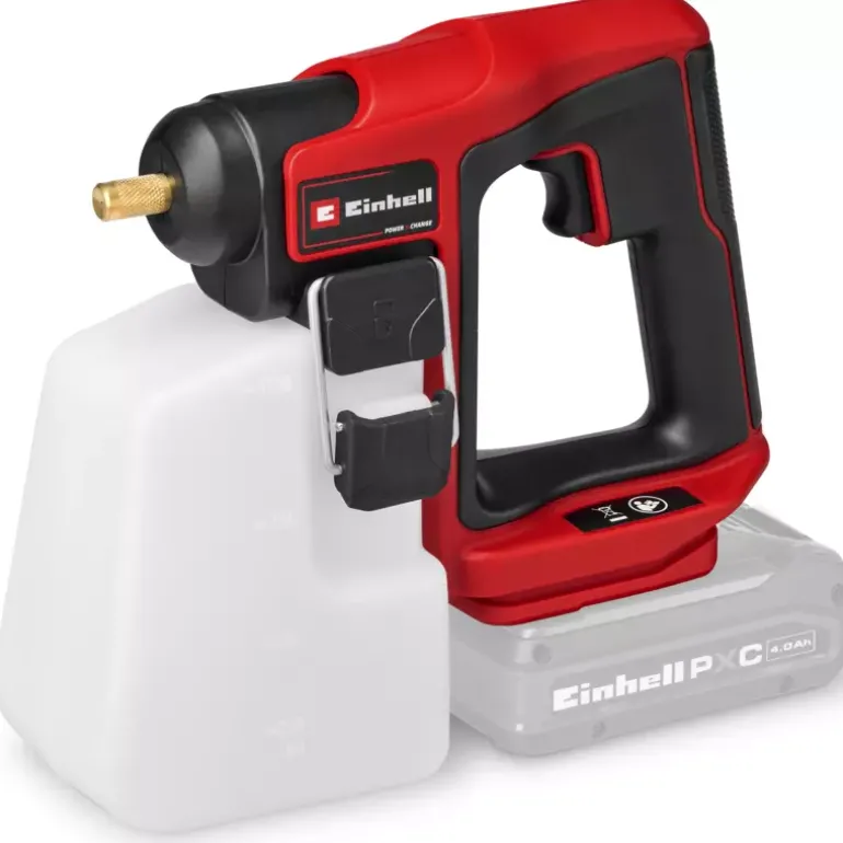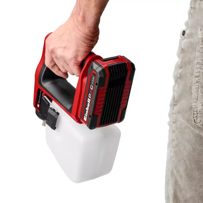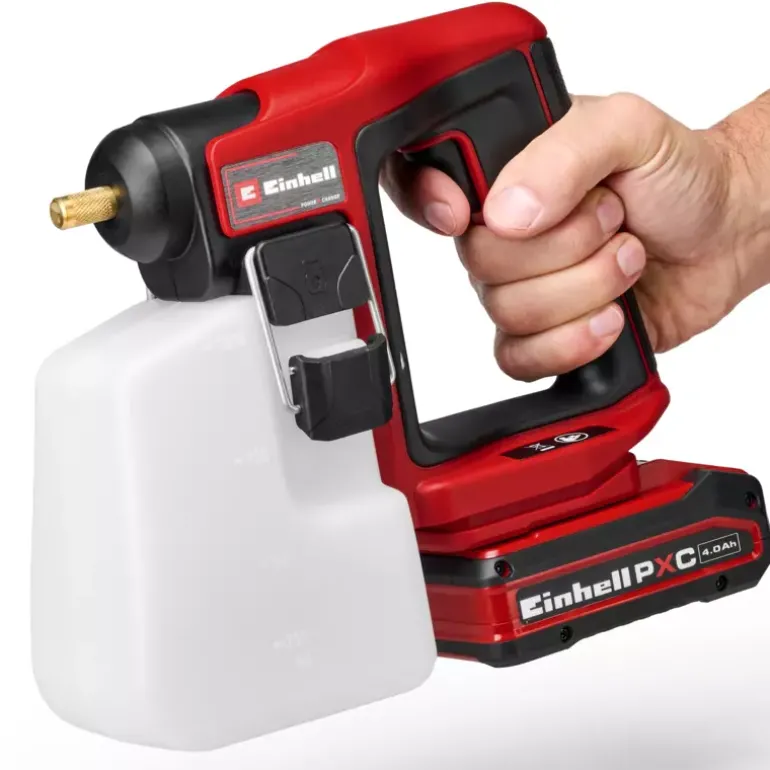 The Einhell cordless pressure sprayer GE-WS 18/10 Li-Solo is part of the powerful Power X-Change system, where batteries, chargers and system devices can be flexibly combined. The pressure sprayer assists in the uniform application of liquid fertiliser, pesticides and herbicides in the home garden. In addition, the sprayer can be used in conjunction with liquid disinfectant to clean various surfaces germ-free. The pressure sprayer is equipped with an automatic pump that converts 1.3 bar and pumps up to 9.6 litres per hour. Manual pressure buildup by elaborate manual pumping is not necessary. The compact, transparent tank holds up to 1 litre of liquid. Thanks to the integrated scale, the filling level can be seen at any time. The tank can be easily opened, closed and removed from the device by the large brackets. Thanks to its slim, ergonomic design and special softgrip surfaces, the 0.6 kg lightweight and compact cordless garden sprayer fits comfortably in the hand. The brass nozzle is individually adjustable to regulate the spray jet. The cordless pressure sprayer GE-WS 18/10 Li-Solo is supplied without a battery or charger. These are available separately, e.g. as a practical starter kit.