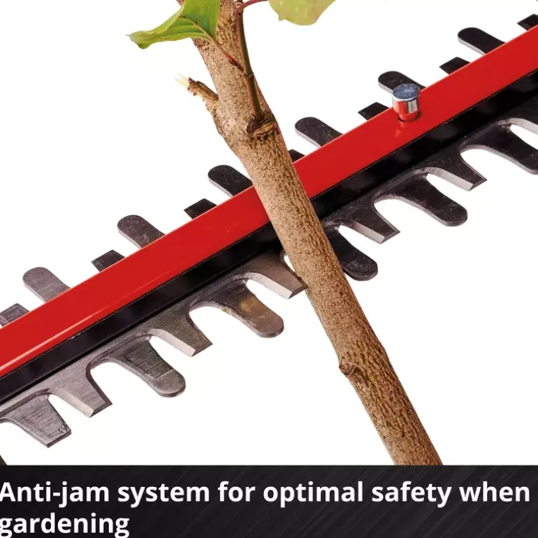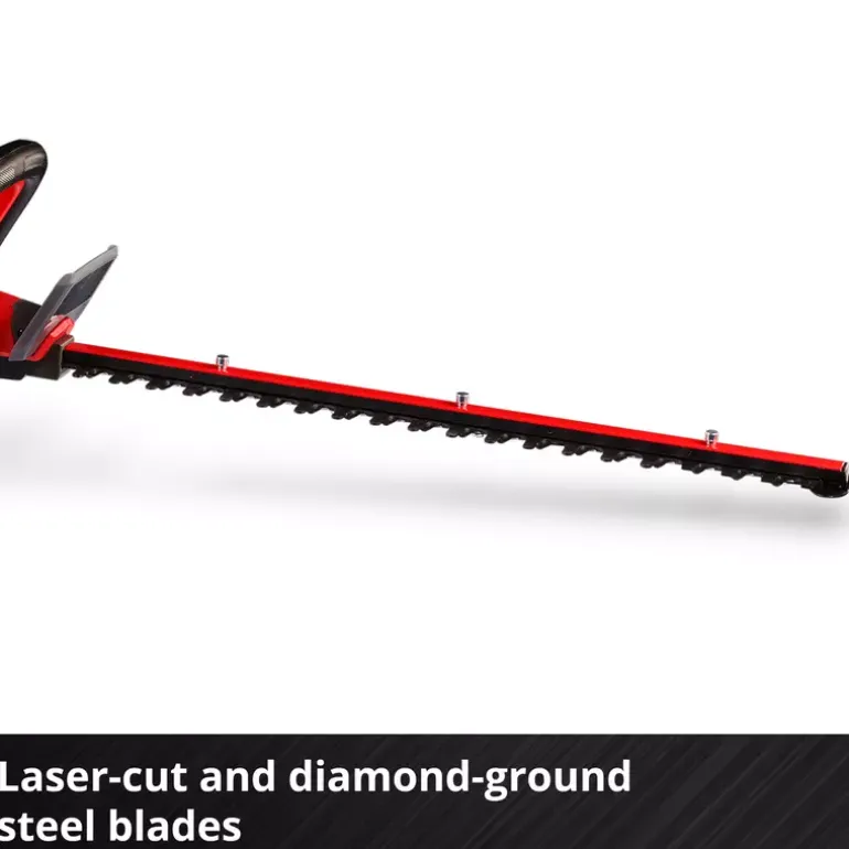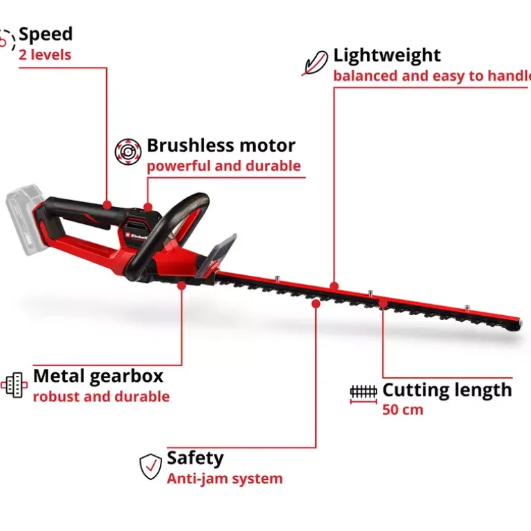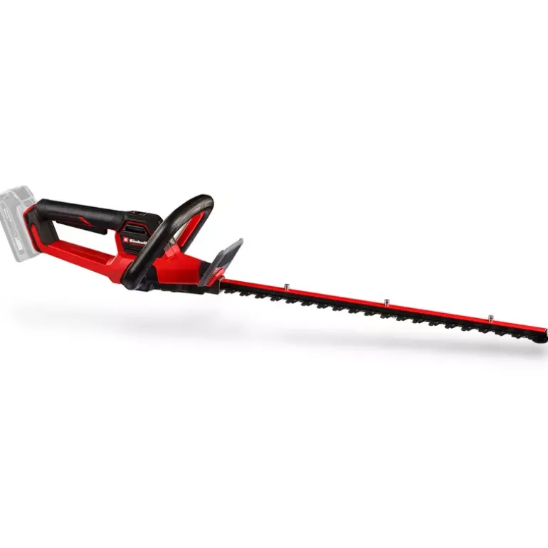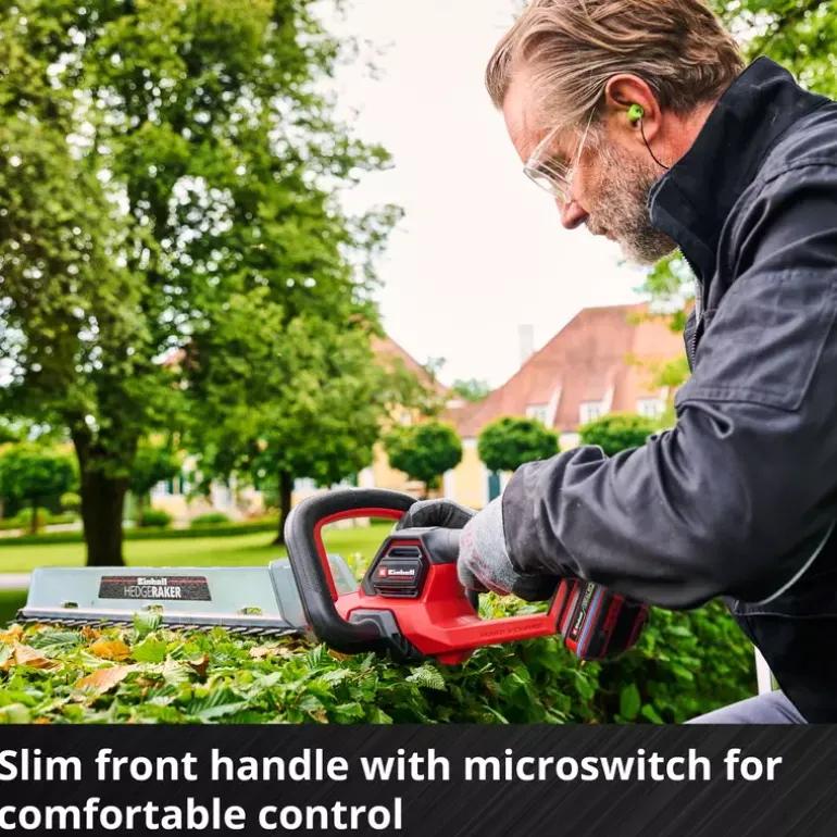 The Einhell Professional cordless hedge trimmer GP-CH 18/50 Li BL-Solo is a valuable helper in any garden. As a member of the Einhell Power X-Change family, it operates on a powerful 18 V lithium-ion battery, allowing for flexible cordless use. The device is powered by the Einhell Brushless motor. This brushless motor offers more power and a longer run time than conventional carbon brush motors. Once you register online, the brushless motor has a 10-year guarantee. Weighing just 2.6 kg, this compact hedge trimmer is easy to handle. The narrow front handle with microswitch allows precise shaping and cutting of hedges and bushes. The durable metal gearbox enhances the transfer of battery power to the precise laser-cut and diamond-cut steel blades which have a cutting length of 50 cm and a tooth spacing of 20 mm. The blade length is 56 cm. This means that even medium-sized to large hedges can be optimally cut. For even better cutting results, the two-stage speed control offers an ECO mode for extended battery life and a MAX POWER mode for optimal cutting speed, making it easy to tackle thick branches. The anti-lock braking system and hand protection ensure a high level of safety when working. The removable clippings collector allows the clippings to be removed quickly. The integrated shock protection and the aluminium blade cover protect the quality knives and a stable quiver is included for safe transport and storage. The Einhell Professional GP-CH 18/50 Li BL-Solo cordless pruning shears are delivered without a battery or charger. These are available separately.