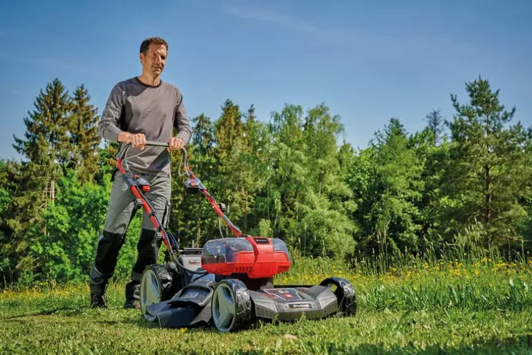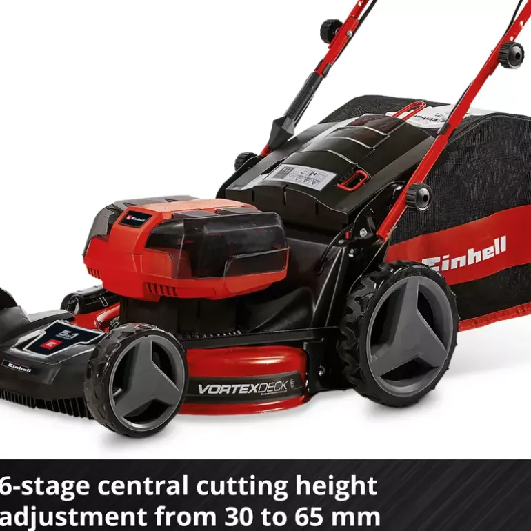 The Einhell Professional cordless lawn mower GP-CM 36/47 S HW Li makes taking care of the garden a real pleasure. For knocking grassed areas into shape and tidying up edge strips, get straight down to work without interfering cables, tripping hazards or laborious starting up. Because with the Power X-Change battery system the power required for the brushless electric motor is supplied by two powerful system batteries with 18 V and 4.0 Ah each. Thanks to the battery charge level indicator with three LEDs, the remaining energy available is clearly indicated at all times. The rechargeable batteries from the Power X-Change series can be used in any of the products from the Einhell system series. For quick charging there are two system twinchargers included. Perfect cutting results are ensured every time related to Einhell Vortex Technology Deck and six-position single lever height adjustment. Thanks to the four batteries in delivery and the double twin pack technology a longer mowing without recharging is possible. The lawnmower is recommended for lawn areas up to 700 m². Einhell has designed the practical handle to include a cleaning and space-saving storage position. The folding long handle with Softgrip is height-adjustable to three different levels. As a high wheeler with ball-bearing mounted wheels and a cutting width of 47 cm, the cordless lawn has no problem with more challenging terrain either. A variable wheel drive also helps for a better mower handling. The side ejector function and deflector for ejecting cuttings to the rear ensure that cuttings are optimally guided to the side. The large grass catch basket (75 l volume) has a level indicator and two practical handles for emptying. Thanks to the practical mulch adapter the cordless lawn mower also has a mulching function. For optimum cleaning in the cleaning position, a scraper is also included.