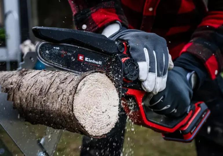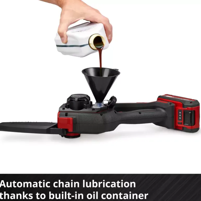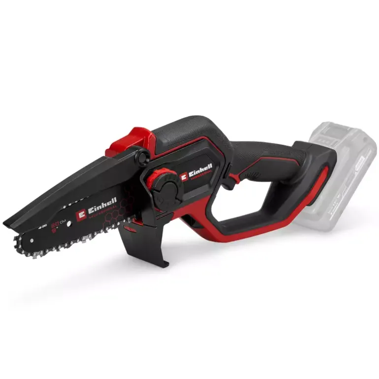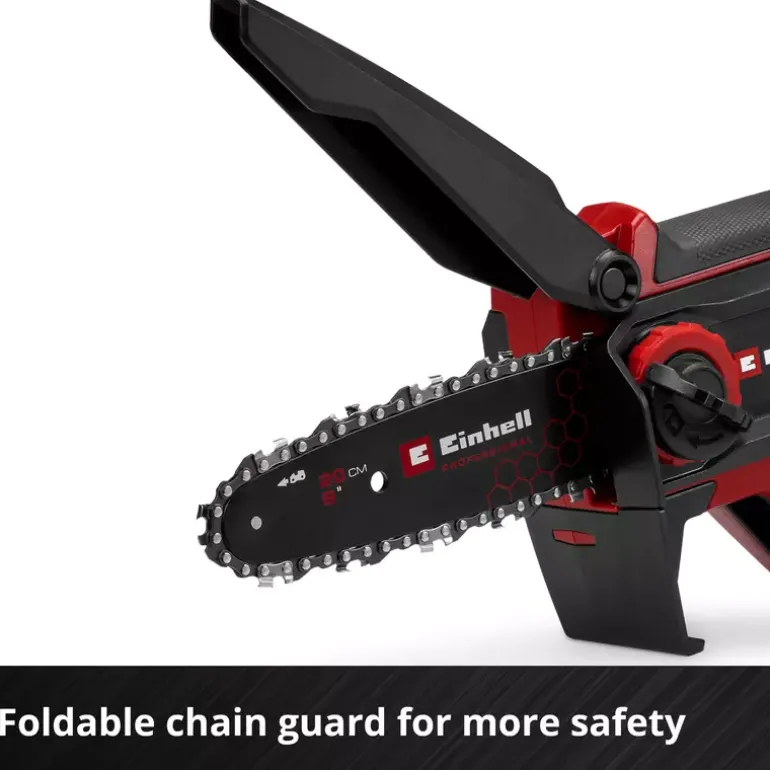 The Einhell Professional cordless pruning chainsaw GP-PS 18/20 Li BL-Solo is a versatile and handy tool for trimming trees and shrubs as well as for shredding green cuttings and for smaller hewing work. As member of the Power X-Change family, it can be used in combination with any battery or charger from the system series. The tool is powered by an Einhell Brushless motor. This brushless motor provides more power and longer runtimes than a conventional carbon brush motor. Once you register online, there is a 10-year warranty on the Brushless motor. With a guide bar length of 19.2 cm and a cutting length of 15 cm, the small and lightweight cordless pruning chain saw is perfect for flexible use in the garden. The efficient motor minimizes vibration and enables a chain speed of up to 8 m/s. Delivery includes a high-quality guide bar and chain set, which enables precise cuts and optimal work results. Maintenance of the chainsaw, such as exchanging the bar and chain and adjusting chain tension, is particularly easy and can be done toollessly thanks to the rotary switch. A built-in hand protection and a foldable chain guard ensure safety and flexibility. The ergonomic design with narrow handle, soft grip surfaces and a hand rest surface for two-handed use ensures high comfort. A guide bar cover protects the device during storage. For refilling the automatic chain lubrication cleanly, an oil funnel is included. Delivery does not include a battery or charger, but these are available separately, e.g. as a starter set.