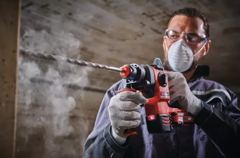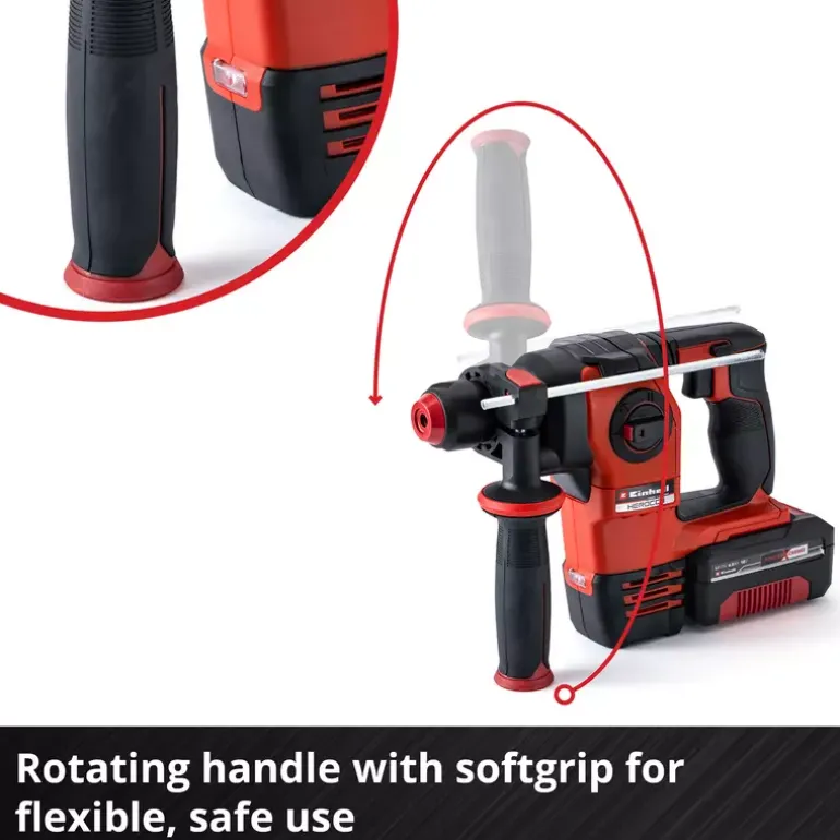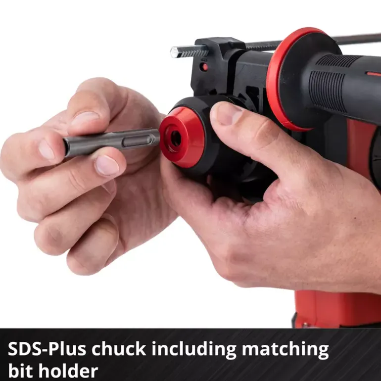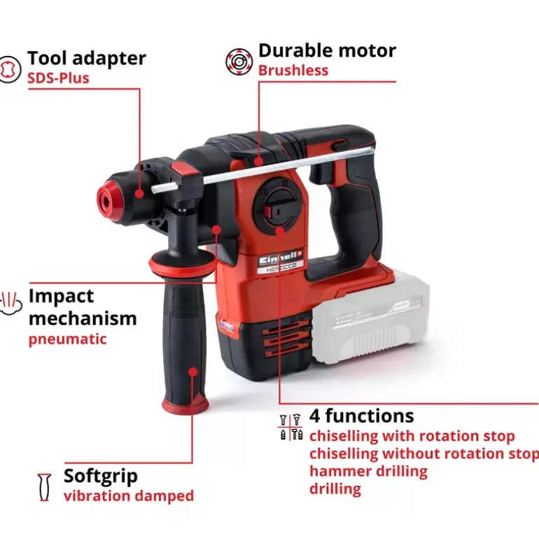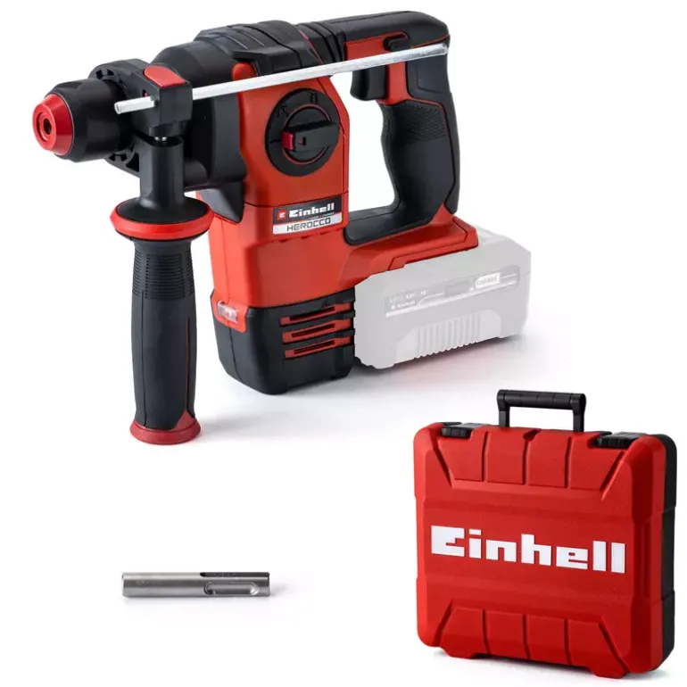 The Einhell cordless rotary hammer Herocco 18/20 is a reliable performer: for drilling, impact drilling or chiseling with or without lock, the cordless rotary hammer is a valued allrounder. The device is powered by the Einhell PurePOWER brushless motor. This brushless motor offers more power and a longer running time than conventional carbon brush motors. After registering online, the brushless motor comes with a 10-year warranty. Designed as a member of the Power X-Change family, all the rechargeable batteries in the system series can be used flexibly and without restriction in the workshed and garden tool products from the system series. The pneumatic impact mechanism, which has a frequency of up to 5,500 impacts per minute, makes effortless work of drilling even into concrete – with a impact power of 2.2 joules and a drilling capacity in concrete of 20 millimeters. Tools can be changed quickly thanks to the universal SDS-plus tool chuck with auto-slip-in function. The speed electronics is finely adjustable for sensitive operation. For comfortable and tireless operation the grip area is ergonomically designed and has a soft grip. The LED light provides optimum illumination for the work area. The product is supplied with a magnetic bit adapter for screwing in a transport and storage case E-Box. The batteries and charger are available separately. For optimum operation it is recommended to use a 3.0 Ah battery or higher.