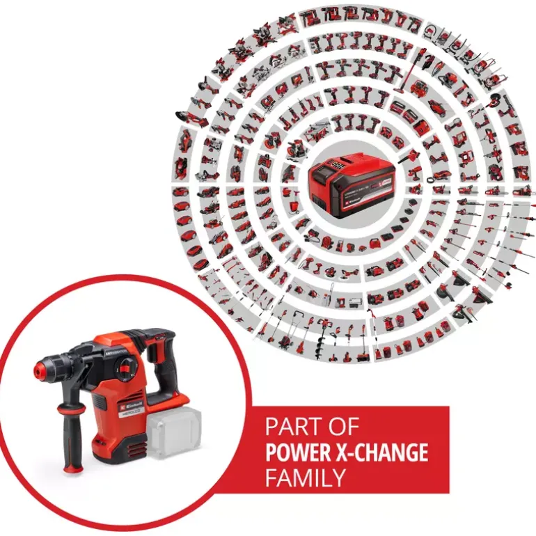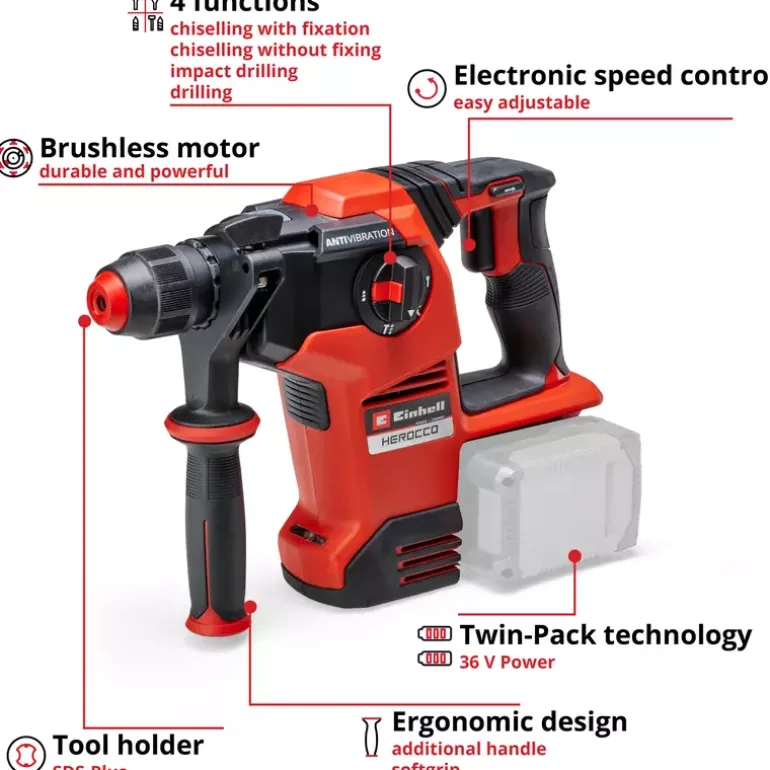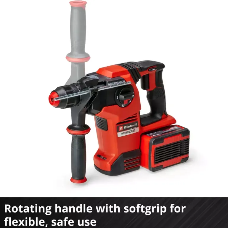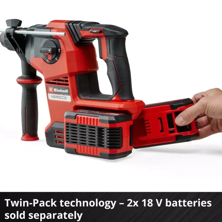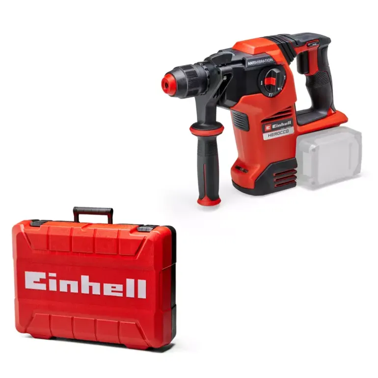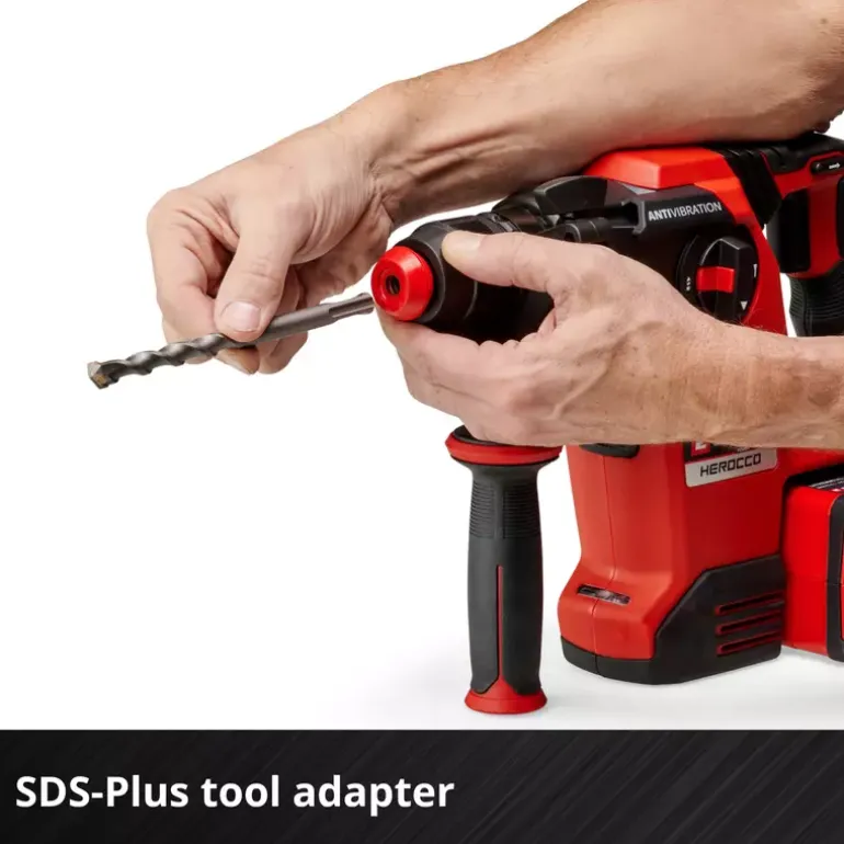 The Einhell cordless rotary hammer Herocco 36/28 is a powerful helper on the building site, combining 3.2 joules of impact power with a high drilling capacity and the freedom of cordless technology. As a member of the Power-X-Change series from Einhell, all the high-quality lithium-ion rechargeable batteries from the series can be used in the rotary hammer. With the TWIN-PACK technology the rotary hammer is powered by two 18 V Power X-Change rechargeable batteries, which means: More power for tackling touch materials. The rotary hammer combines four functions in one: Drilling and impact drilling and chiseling with and without lock. The device is powered by the Einhell PurePOWER brushless motor. This brushless motor offers more power and a longer running time than conventional carbon brush motors. After registering online, the brushless motor comes with a 10-year warranty. The pneumatic impact mechanism of the rotary hammer makes light work of continuous drilling in concrete. The rotary hammer is equipped with a universal SDS-plus tool chuck with semi-automatic function, precision speed electronics for sensitive operation despite all the power of the rotary hammer, and an infinitely adjustable drilling depth stop made of solid metal. For enhanced handling comfort, the cordless rotary hammer has a vibration-cushioned main handle to reduce vibrations while working. In addition, the rotary hammer has an additional handle with soft grip and ribs for secure fastening, and for extra user safety there is an overload slip coupling. For optimum visibility in the work area, the rotary hammer has an LED light. Two 18 V Power X-Change rechargeable batteries are required for operation. For optimum results it is recommended that 3.0 Ah rechargeable batteries or higher be used. The product is supplied in a practical transport and storage case E-Box, without a battery or charger. These are available separately.