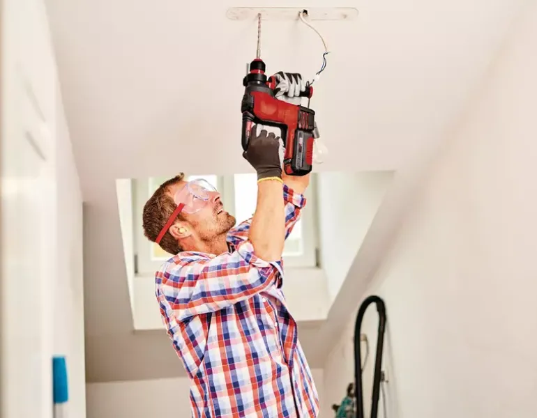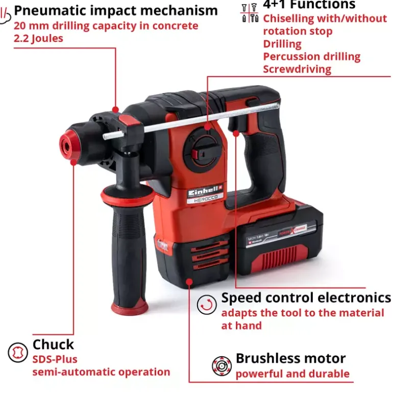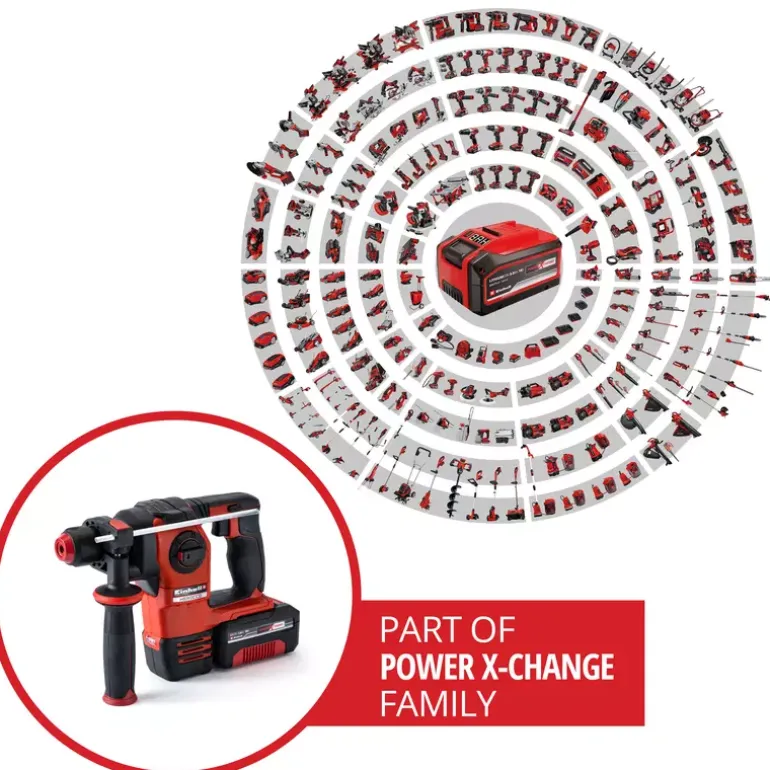 The Herocco Einhell cordless rotary hammer is a sought-after all-rounder: It delivers reliable performance for drilling, hammer drilling and chiselling with and without fixing. The brushless motor offers more force and longer running time than conventional brush motors. The pneumatic impact mechanism works with a frequency of up to 5,500 bpm and an impact force of 2.2 Joules. When chiselling, tiles and bricks don’t stand a chance against the power of the Herocco. And even concrete and granite cannot withstand its drilling power. The universal SDS-Plus tool holder with semi-automatic operation for quick tool change. The speed electronics can be finely metered for delicate work. Operation is pleasant and fatigue-free thanks to the ergonomic handle and additional handle with softgrip. The anti-vibration handle protects from vibrations and enables extremely precise work. The robust, solid metal drill depth stop is infinitely adjustable. The Herocco cordless rotary hammer is fitted with a LED light for optimally lighting your working area. Designed as a member of the Power X-Change family, all batteries in the system range can be used with unlimited flexibility in the workshop and garden tools of the system series. The Einhell cordless rotary hammer Herocco kits include the magnetic bit adapter for screwing, a 3,0 Ah Power X-Change battery, a charger, three different drill bits, a flat chisel, a pointed chisel and an E-Box for practical transport and storage.