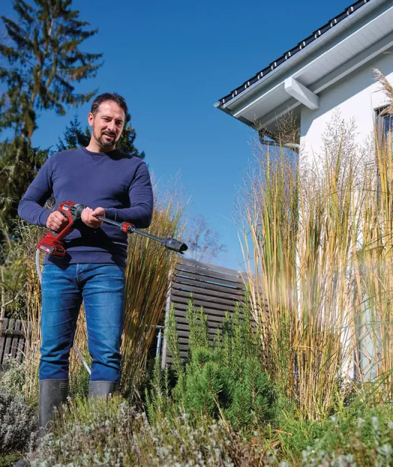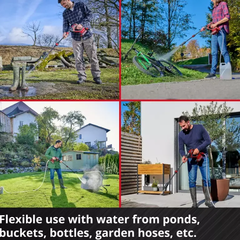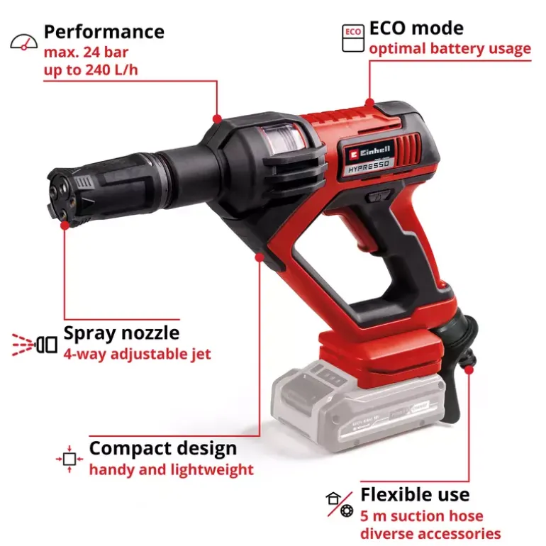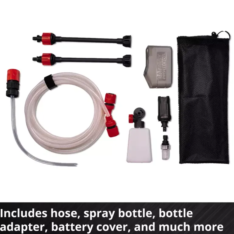 The Einhell HYPRESSO 18/24-1 cordless pressure washer gun enables cable-free flexibility for cleaning and watering around the garden and terrace. The cordless pressure washer gun is a part of the Power X-Change family, where all batteries, tools and charging devices can be flexibly combined across the system. The cordless medium-pressure washer operates at a pressure of up to 24 bar and a flow rate of up to 240 litres of water per hour. The ECO mode means the battery life of the pressure washer can be extended at the touch of a button. The spray gun is equipped with a 4-way adjustable nozzle. It has narrow and wide jets, as well as a spray jet for watering and a rotating jet for cleaning stubborn dirt. The medium-pressure cleaning gun can not only be connected directly to the garden hose via its hose connection, but can also take in water from buckets, jerrycans or ponds thanks to the water filter and 5-metre suction hose. A bottle adapter is included to use water from standard PET bottles when on the go. The set also includes two extension lances, a foam spray bottle, which is ideal for washing the car, and a mesh bag to store the accessories. In addition, a water splash guard, which simply pulls over the Power X-Change battery to provide additional protection against splashes and moisture, is included. The HYPRESSO 18/24-1 cordless pressure washer gun comes without a battery or charging device. These are available separately.