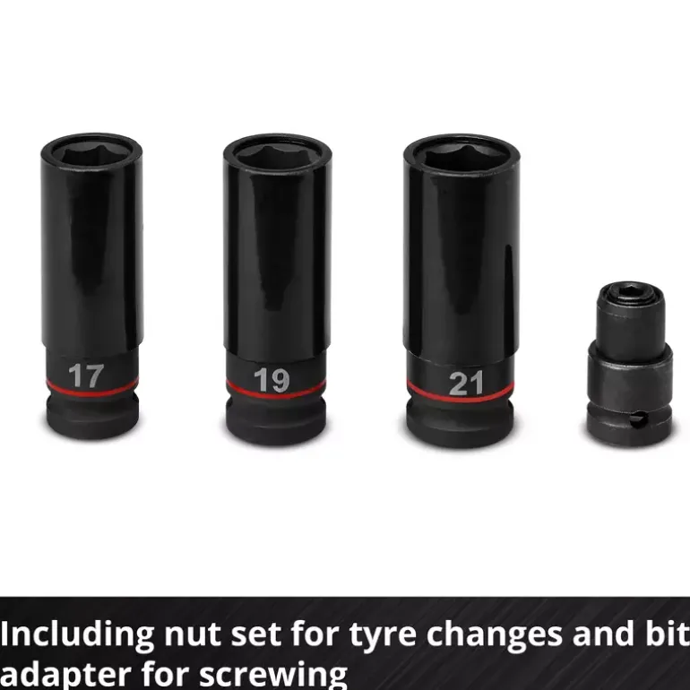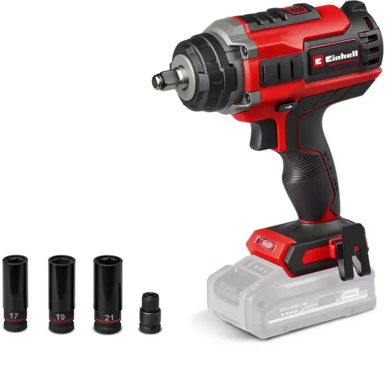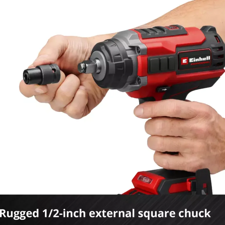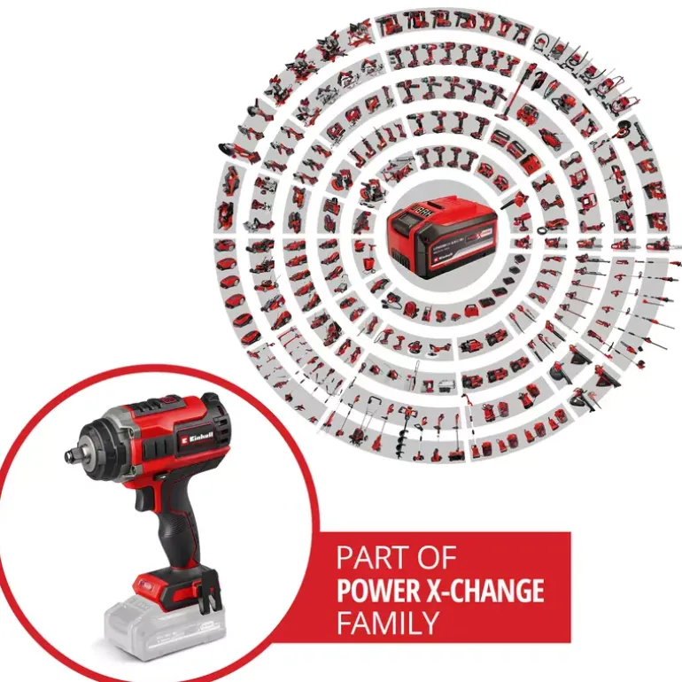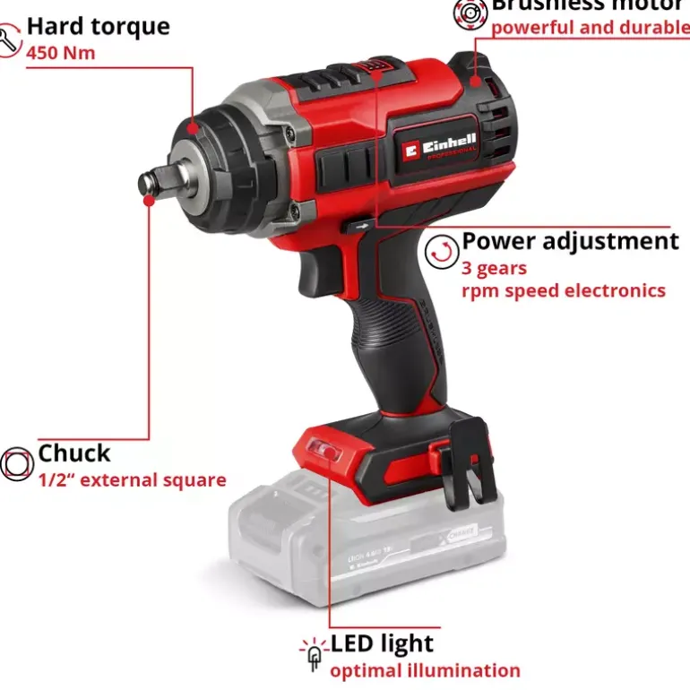 The Einhell Professional cordless impact wrench IMPAXXO 18/450 effortlessly screws in large or long screws and, unlike impact wrenches, protects the joints of the trade worker when in use. As a member of the high-quality Power X-Change family, each battery in the high-performance product series can be combined with the impact wrench. A cordless impact wrench is suitable for a variety of uses in the house, the workshop and especially in the garage. The tool is powered by an Einhell brushless motor. This brushless motor offers more power and a longer running time than conventional carbon brush motors. Once you register online, the brushless motor has a 10-year guarantee. The high torque supports easy loosening of wheel nuts. The rpm and/or torque of the application can be optimally adjusted by means of three stages. The maximum torque is 450 Nm, while the breakaway torque is 800 Nm. The cordless impact wrench is provided with a robust 1/2″external square drive and an LED light for optimal illumination of the work area. A bit adapter for screwing and a practical nut set for exchanging car tyres are also included in the scope of delivery. Delivery will be executed without a battery or charging device. These are available separately, e.g. as a starter set in various sizes.