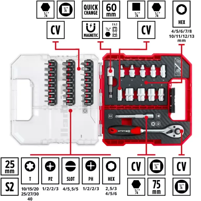 - 23x bits (25 mm) with C 6.3 shank made of sandblasted S2 steel