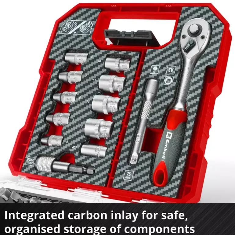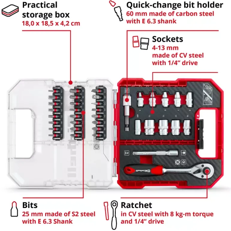 The 37-piece L-CASE from Einhell is a comprehensive tool set that is compatible with all common drill chucks and bit holders in commercially available cordless screwdrivers and drills. It contains a variety of high-quality tools suitable for a wide range of screwing and assembly work. The Einhell set contains 23 bits in 25 mm with a C 6.3 shank and the drive-offs T10 / T15 / T20 / T25 / T27 / T30 / T40 / H2.5 / H3 / H4 / H5 / H6 / PH1 / 2x PH2 / PH3 / PZ1 / 2x PZ2 / PZ3 / SL4 / SL5.5 / SL6.5. The bits are made of robust, grey sandblasted S2 steel and have a coloured ring. The 60 mm long quick-change bit holder made of carbon steel with E 6.3 shank, metal sleeve and strong magnet ensures quick and easy bit changes. In addition, the bit and ratchet set includes a 75 mm extension for sockets made of robust, matt chrome-plated CV steel and two adapters made of satin CV steel. Of these, one adapter has a hex-to-1/4″ drive and the other a 1/4″ to hex drive. For better handling, the nine sockets with 1/4″ drive in the sizes 4 / 5 / 6 / 7 / 8 / 10 / 11 / 12 / 13 mm are made of robust CV steel and have a satin finish with ribbing. Also part of the Einhell tool set is the reversible ratchet, which has a 1/4″ drive, a hardened head with 72 teeth and a maximum torque of 8 kg-m. While the matt chrome-plated CV steel ensures durability, the 2-K handle allows for a good grip. The bit set is neatly stored in a practical storage box in the special Einhell design. The robust auto-lock clip closure allows the box to be closed securely, while the transparent lid means the contents can be seen at a glance. With its extensive selection of high-quality tools, the 37-piece ratchet set is a must-have for DIY enthusiasts and professionals alike.